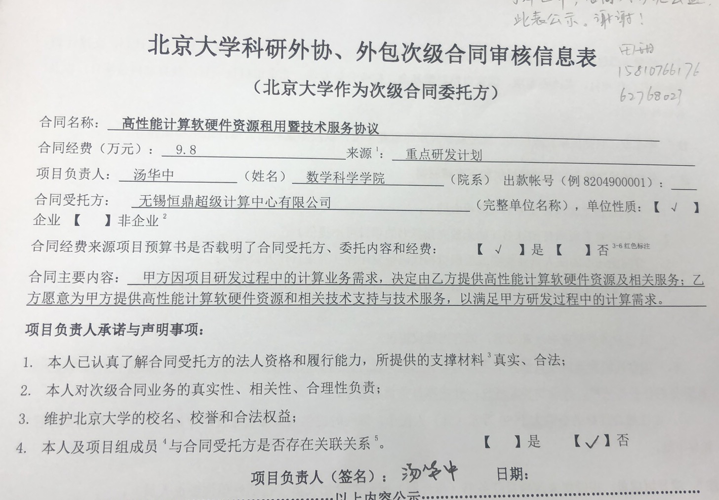 根据《关于北京大学理工科科研次级合同管理的通知》,现将北京大学理工科科研次级合同“高性能计算软硬件资源租用暨技术服务协议”相关内容予以公示。