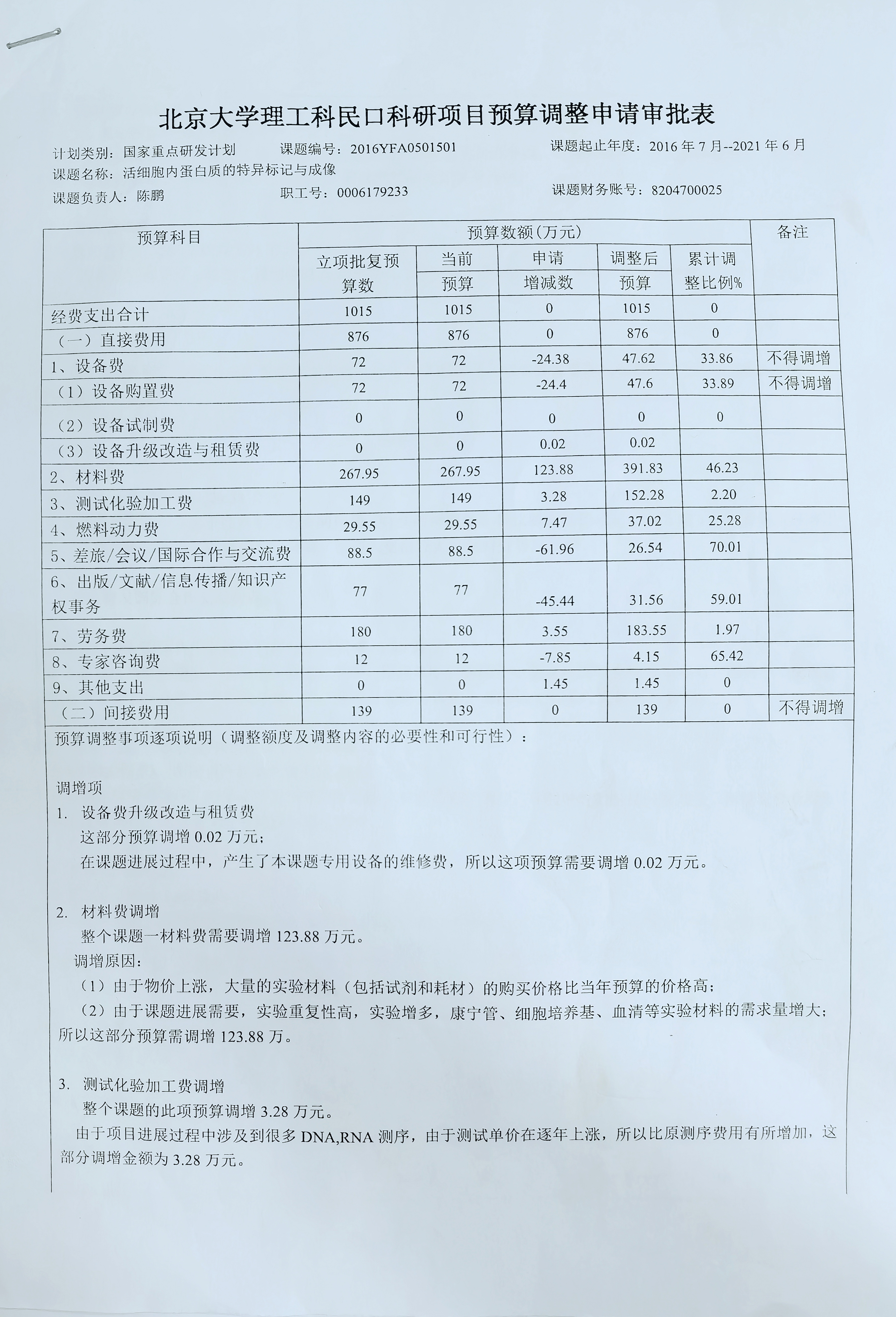 根据《关于实施北京大学理工科民口科研项目预算调剂规定的通知》,现将北京大学理工科民口科研项目“活细胞内蛋白质的特异标记与成像”预算调整申请审批表相关内容予以公示。