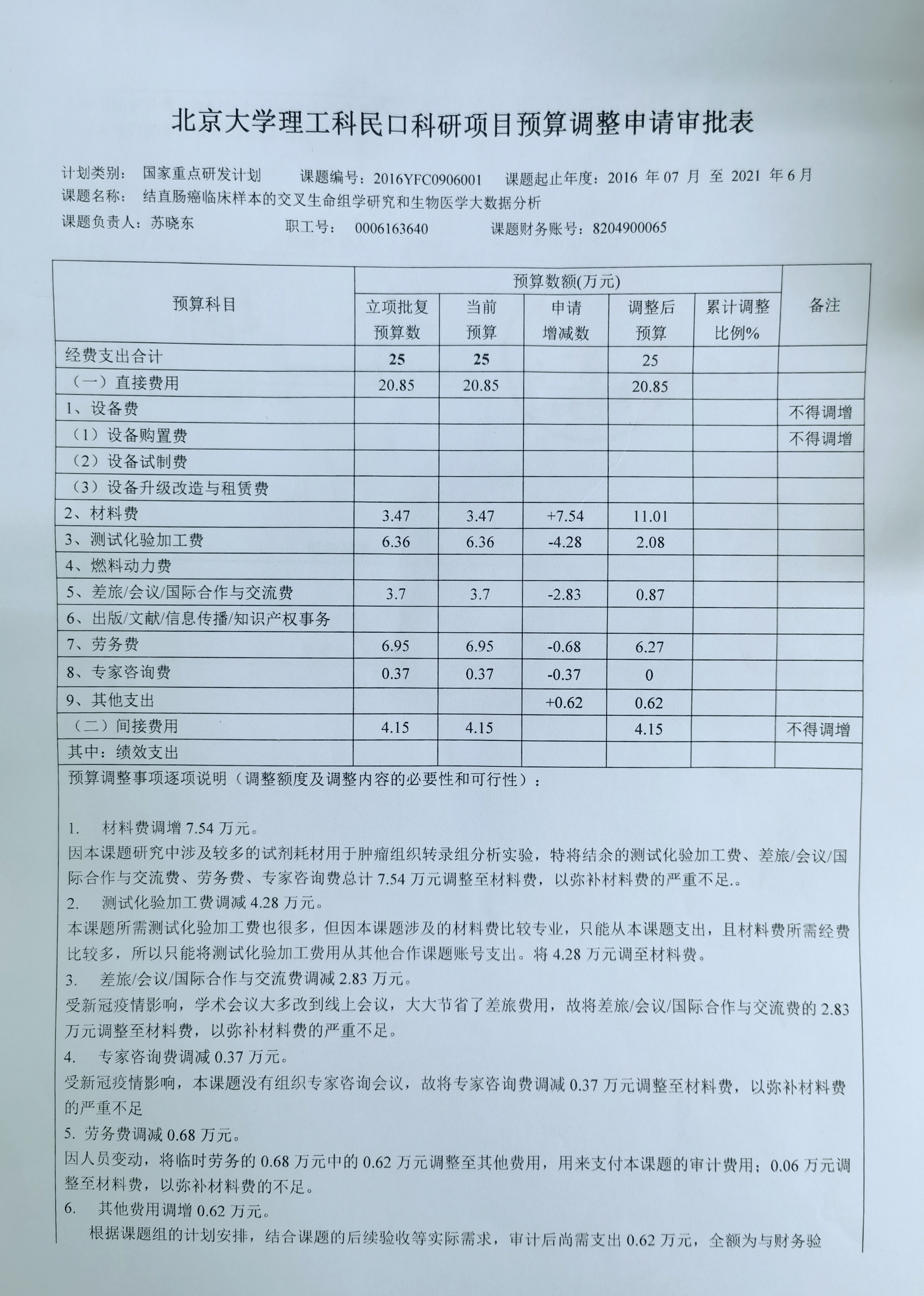 根据《关于实施北京大学理工科民口科研项目预算调剂规定的通知》,现将北京大学理工科民口科研项目“结直肠癌临床样本的交叉生命组学研究和生物医学大数据分析”预算调整申请审批表相关内容予以公示。