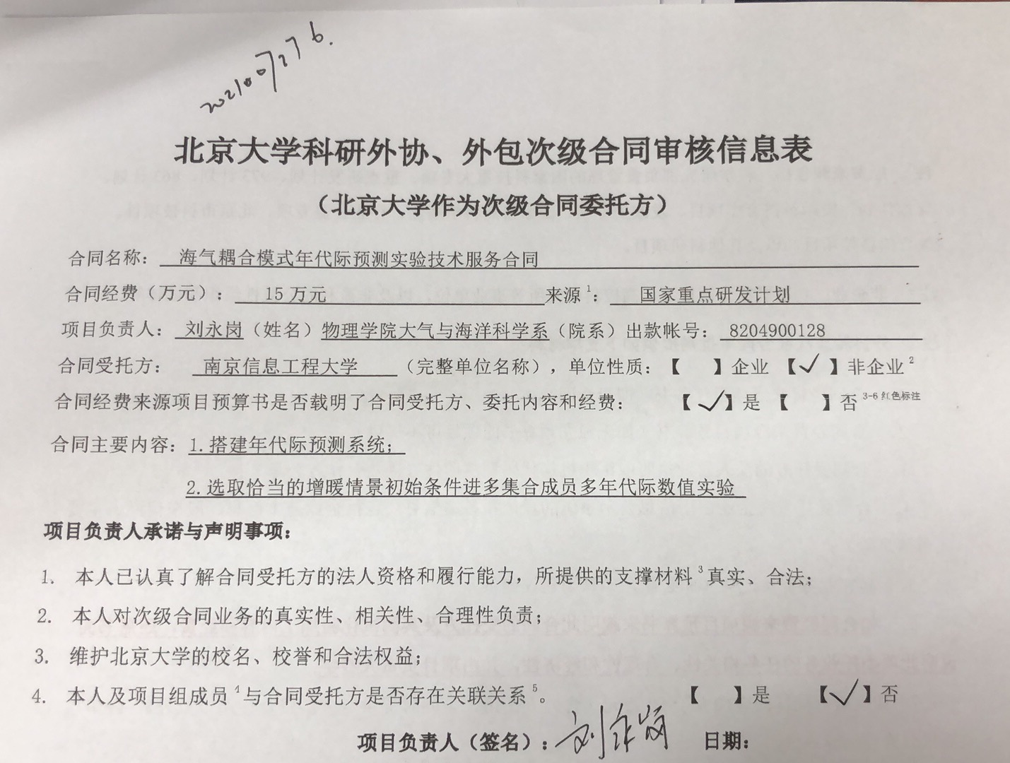根据《关于北京大学理工科科研次级合同管理的通知》,现将北京大学理工科科研次级合同“海气耦合模式年代际预测实验技术服务合同”相关内容予以公示。