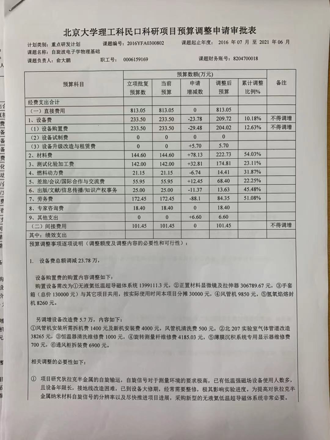根据《关于实施北京大学理工科民口科研项目预算调剂规定的通知》,现将北京大学理工科民口科研项目“自旋波电子学物理基础”预算调整申请审批表相关内容予以公示。
