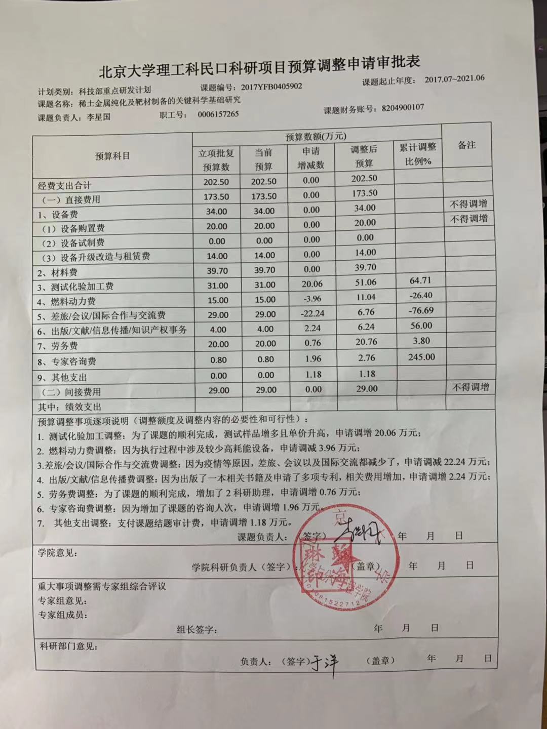 根据《关于实施北京大学理工科民口科研项目预算调剂规定的通知》,现将北京大学理工科民口科研项目“稀土金属纯化及靶材制备的关键科学基础研究”预算调整申请审批表相关内容予以公示。