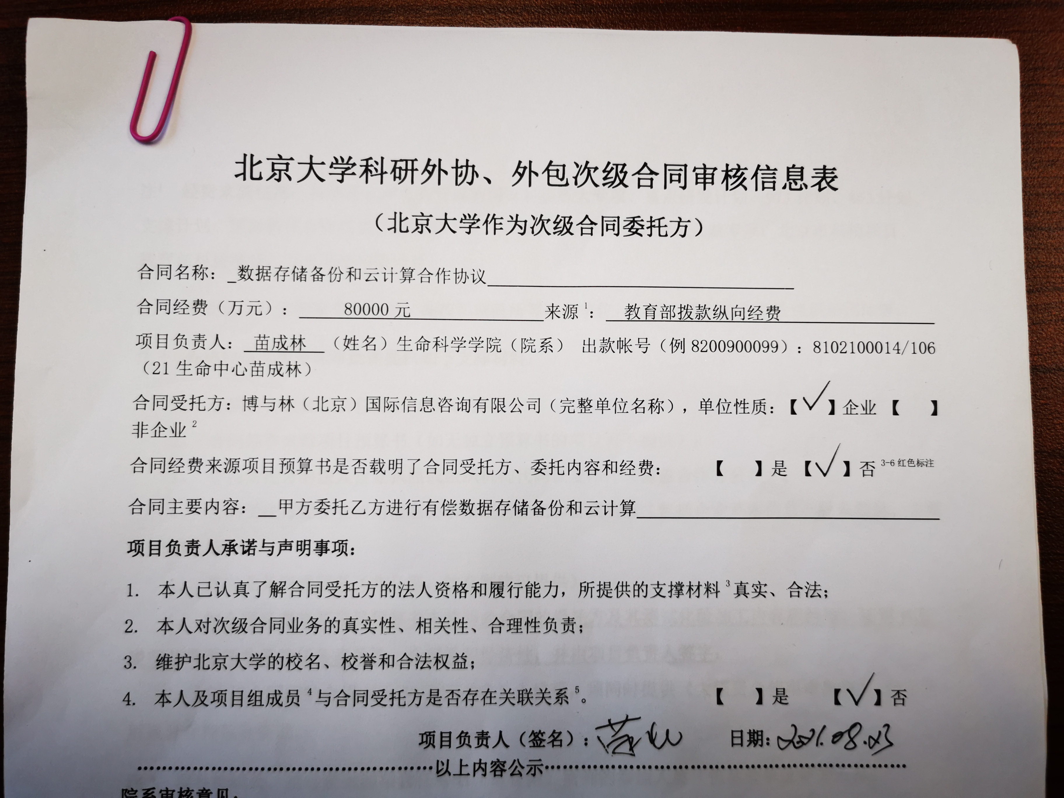 根据《关于北京大学理工科科研次级合同管理的通知》,现将北京大学理工科科研次级合同“数据存储备份和云计算合作协议”的开发相关内容予以公示。公示时间:2021年08月26日-2021年08月30日(3个工作日)。合同相关纸质材料可经预约后到勺园5乙330办公室进行查阅。