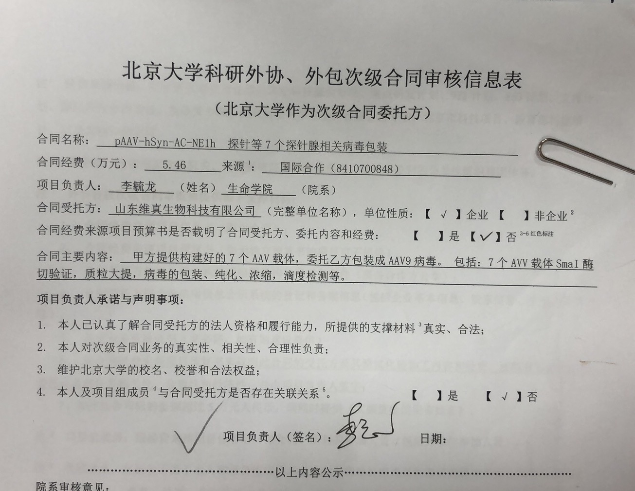 根据《关于北京大学理工科科研次级合同管理的通知》,现将北京大学理工科科研次级合同“pAAV-hSyn-AC-NE1h探针等7个探针腺相关病毒包装”相关内容予以公示。