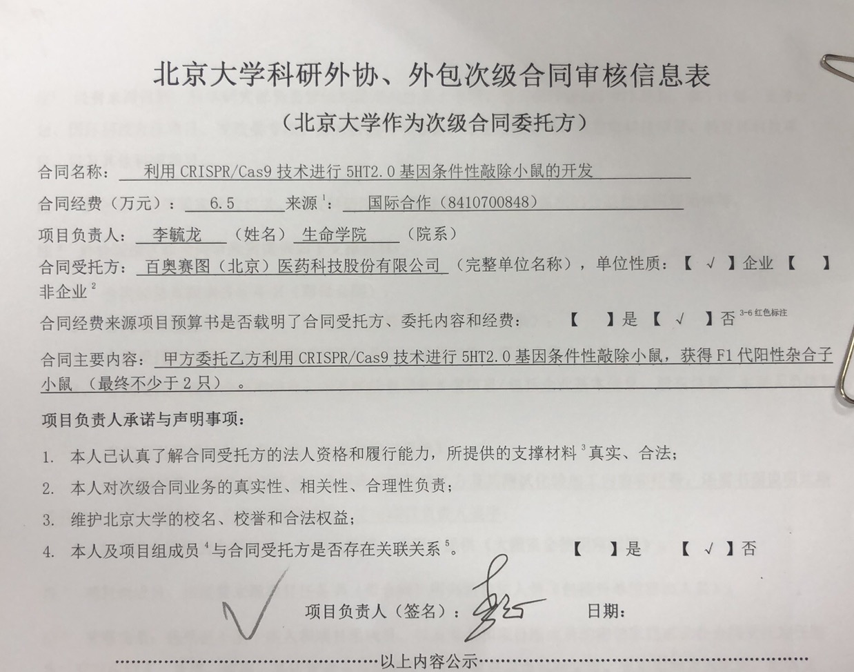 根据《关于北京大学理工科科研次级合同管理的通知》,现将北京大学理工科科研次级合同“利用CRISPR/Cas9技术进行过5HT2.0基因条件性敲除小鼠的开发”相关内容予以公示。