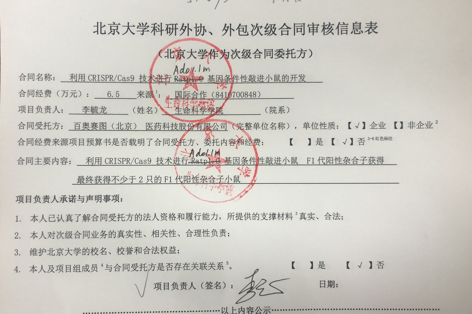 根据《关于北京大学理工科科研次级合同管理的通知》,现将北京大学理工科科研次级合同“利用CRISPR/Cas9技术进行Ado1.1m基因条件性敲进小鼠的开发”相关内容予以公示。