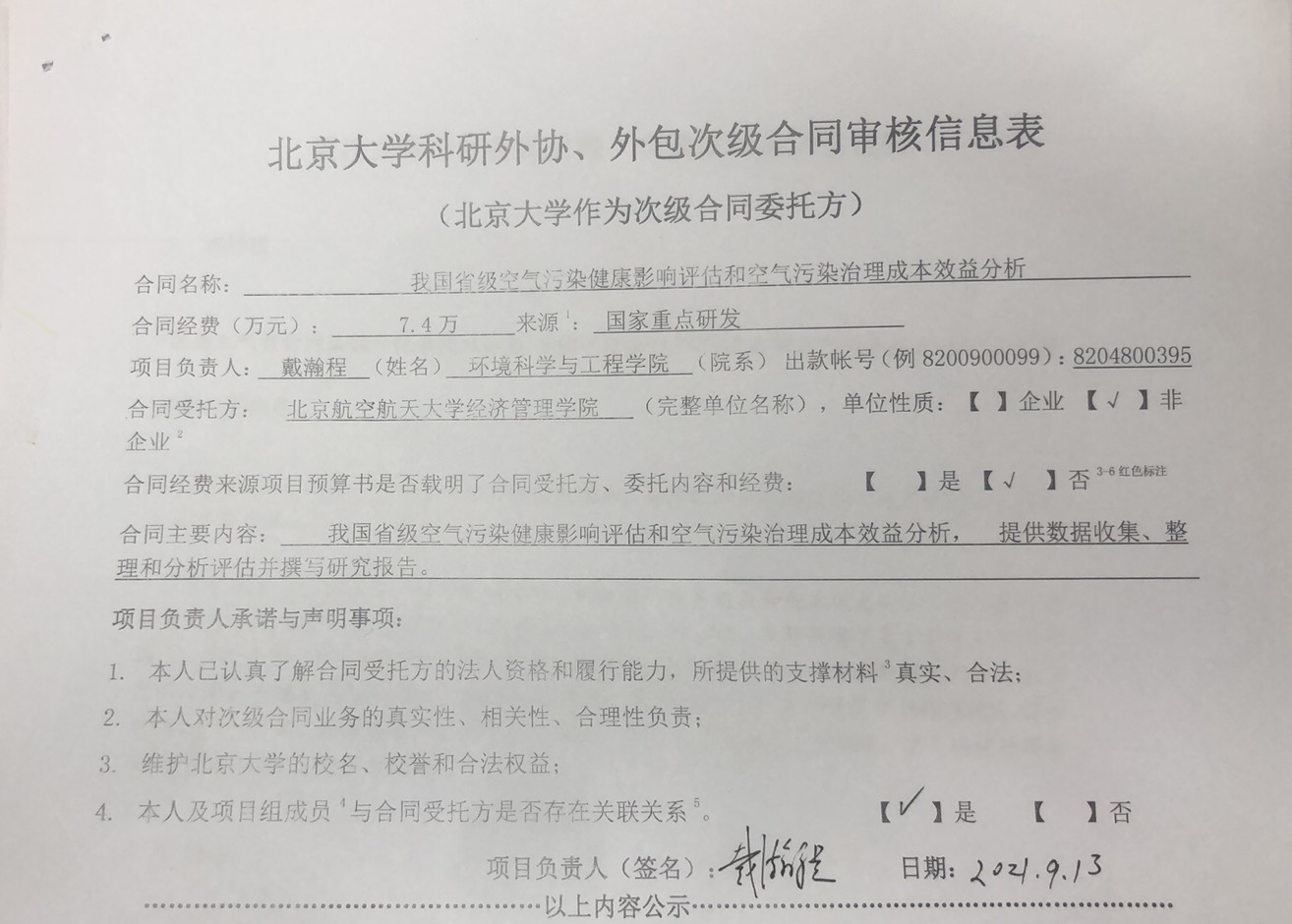 根据《关于北京大学理工科科研次级合同管理的通知》,现将北京大学理工科科研次级合同“我国省级空气污染健康影响评估和空气污染治理成本效益分析”相关内容予以公示。