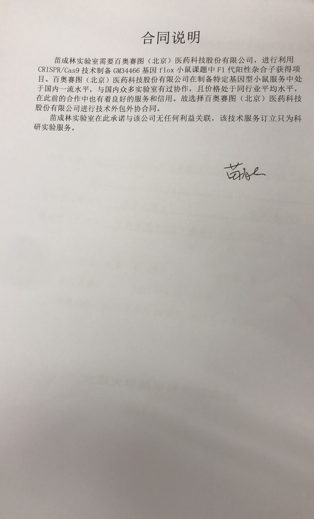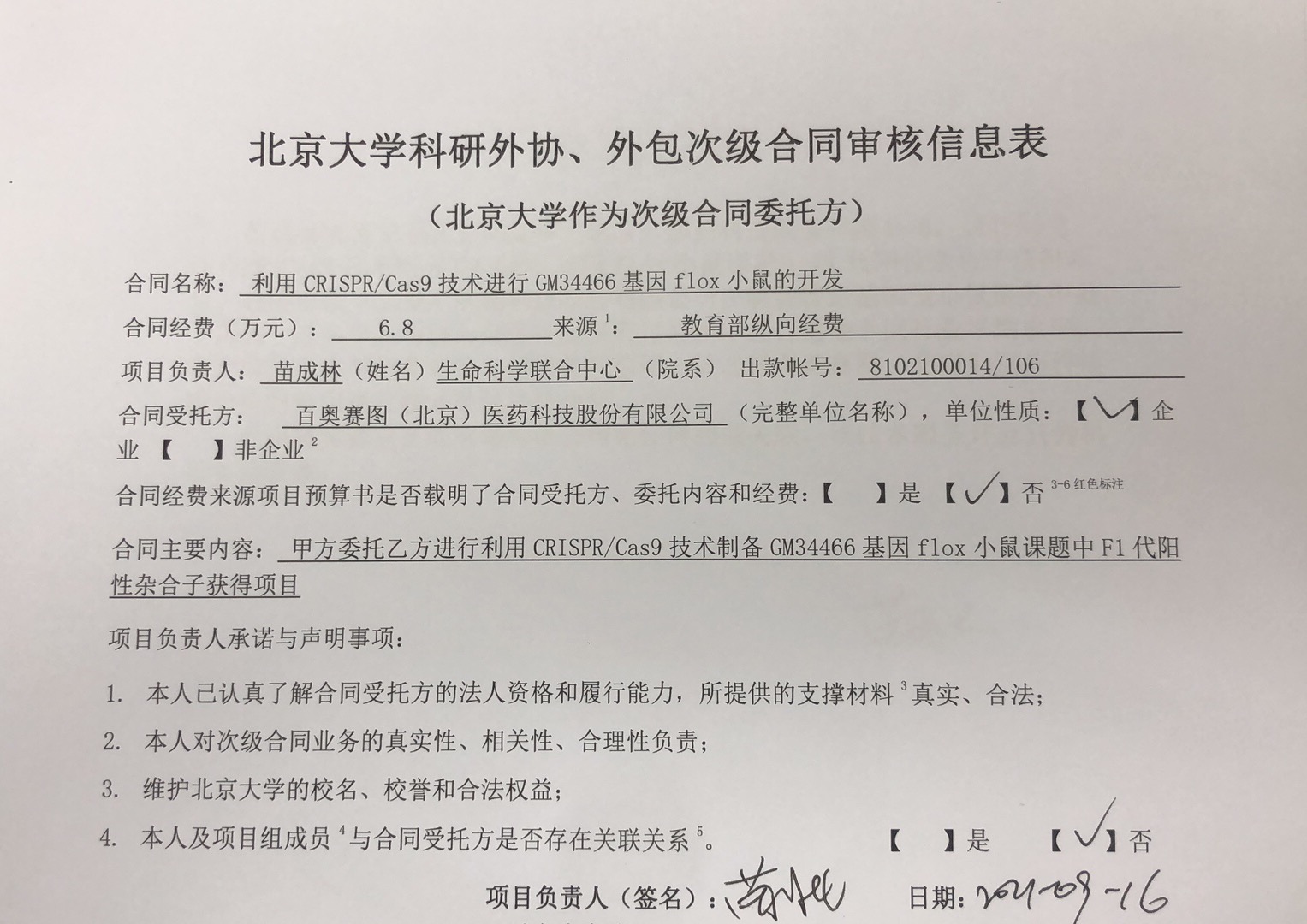 根据《关于北京大学理工科科研次级合同管理的通知》,现将北京大学理工科科研次级合同“利用CRISPR/Cas9技术进行GM34466基因flox小鼠的开发”相关内容予以公示。