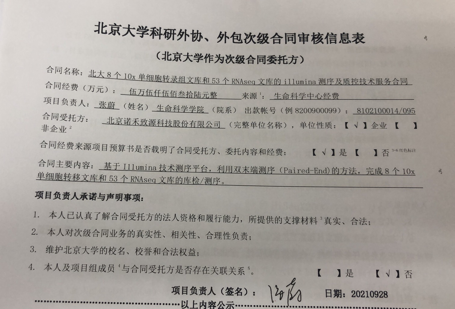 根据《关于北京大学理工科科研次级合同管理的通知》,现将北京大学理工科科研次级合同“北大8个10x单细胞转录组文库和53个RNAseq文库的illumina测序及质控技术服务合同”相关内容予以公示。