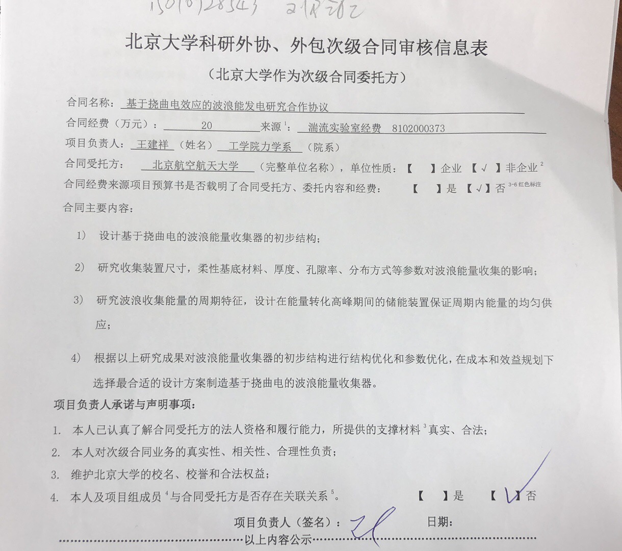 根据《关于北京大学理工科科研次级合同管理的通知》,现将北京大学理工科科研次级合同“基于挠曲电效应的波浪能发电研究合作协议”相关内容予以公示。