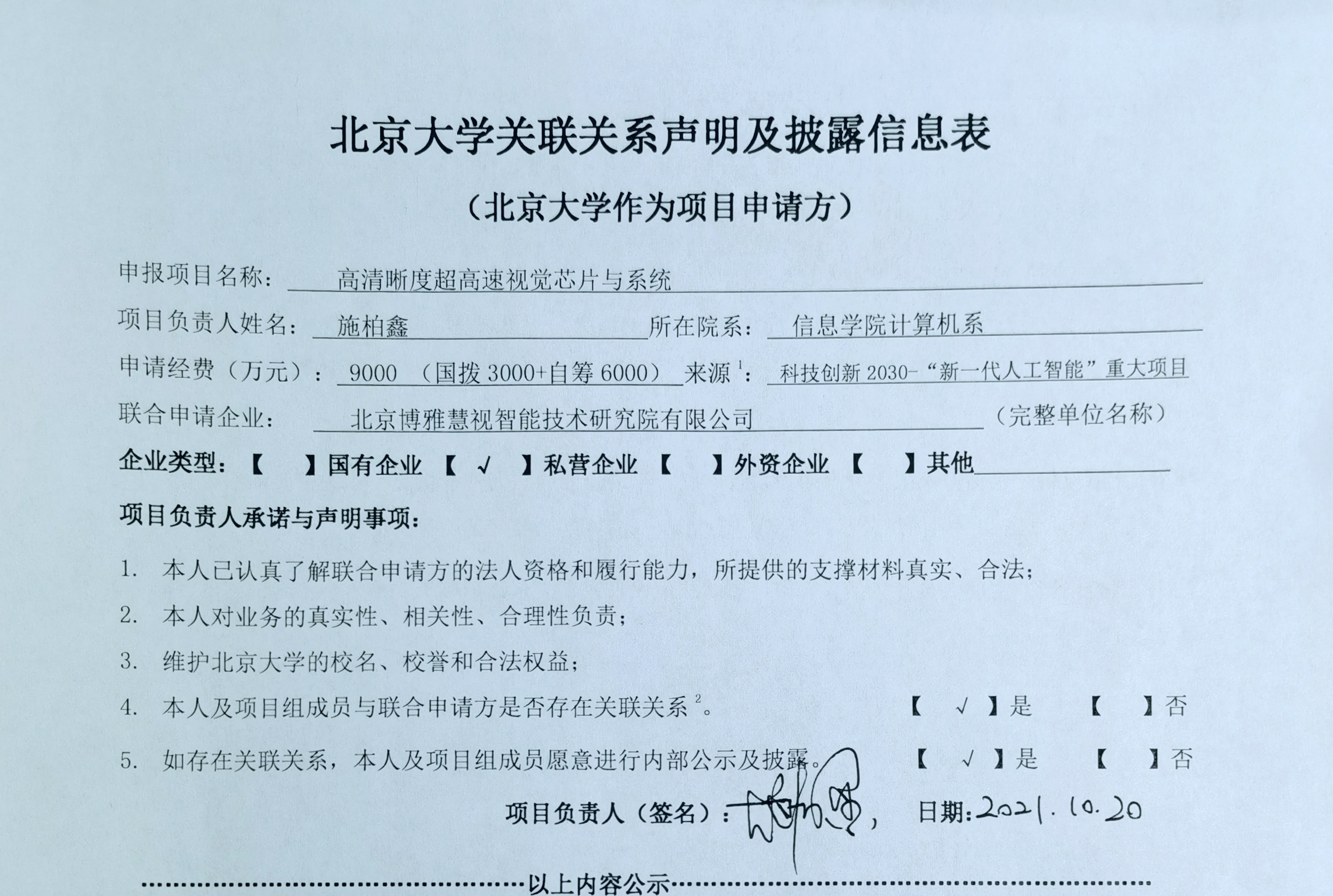 根据科技创新2030重大项目管理相关要求,现将北京大学关联关系声明及披露信息表相关内容予以公示。