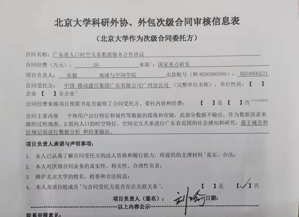 根据《关于北京大学理工科科研次级合同管理的通知》,现将北京大学理工科科研次级合同“广东省人口时空关系数据服务合作协议”相关内容予以公示。