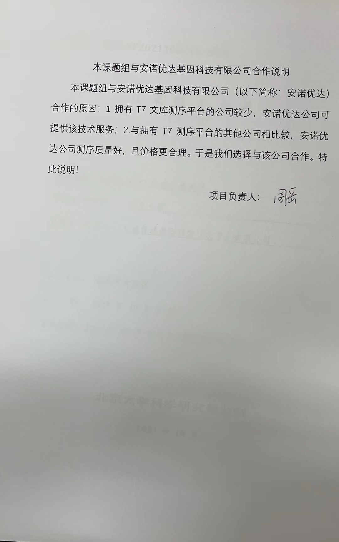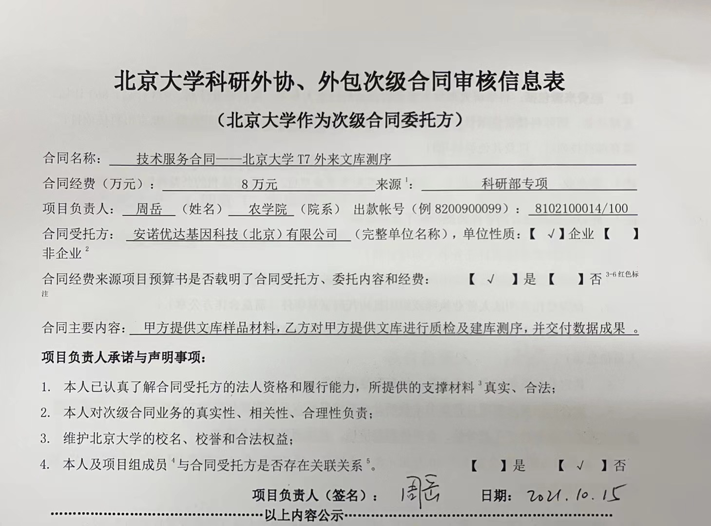 根据《关于北京大学理工科科研次级合同管理的通知》,现将北京大学理工科科研次级合同“技术服务合同-北京大学T7外来文库测序”相关内容予以公示。