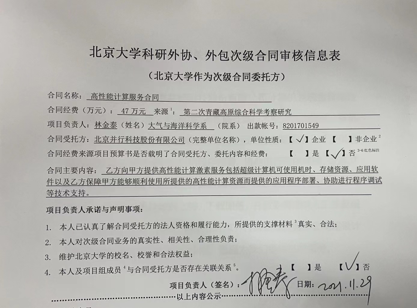 根据《关于北京大学理工科科研次级合同管理的通知》,现将北京大学理工科科研次级合同“高性能计算服务合同”相关内容予以公示。