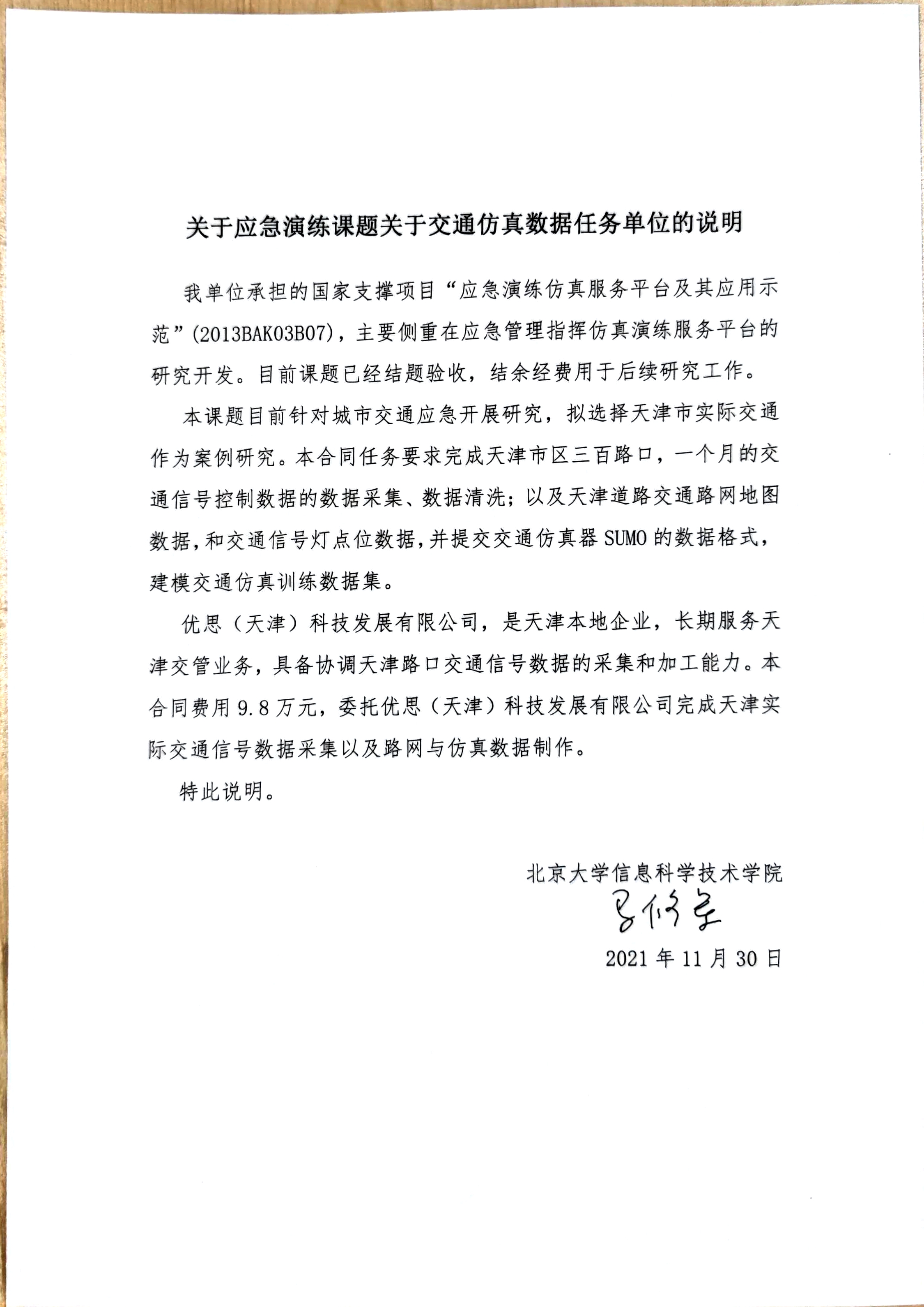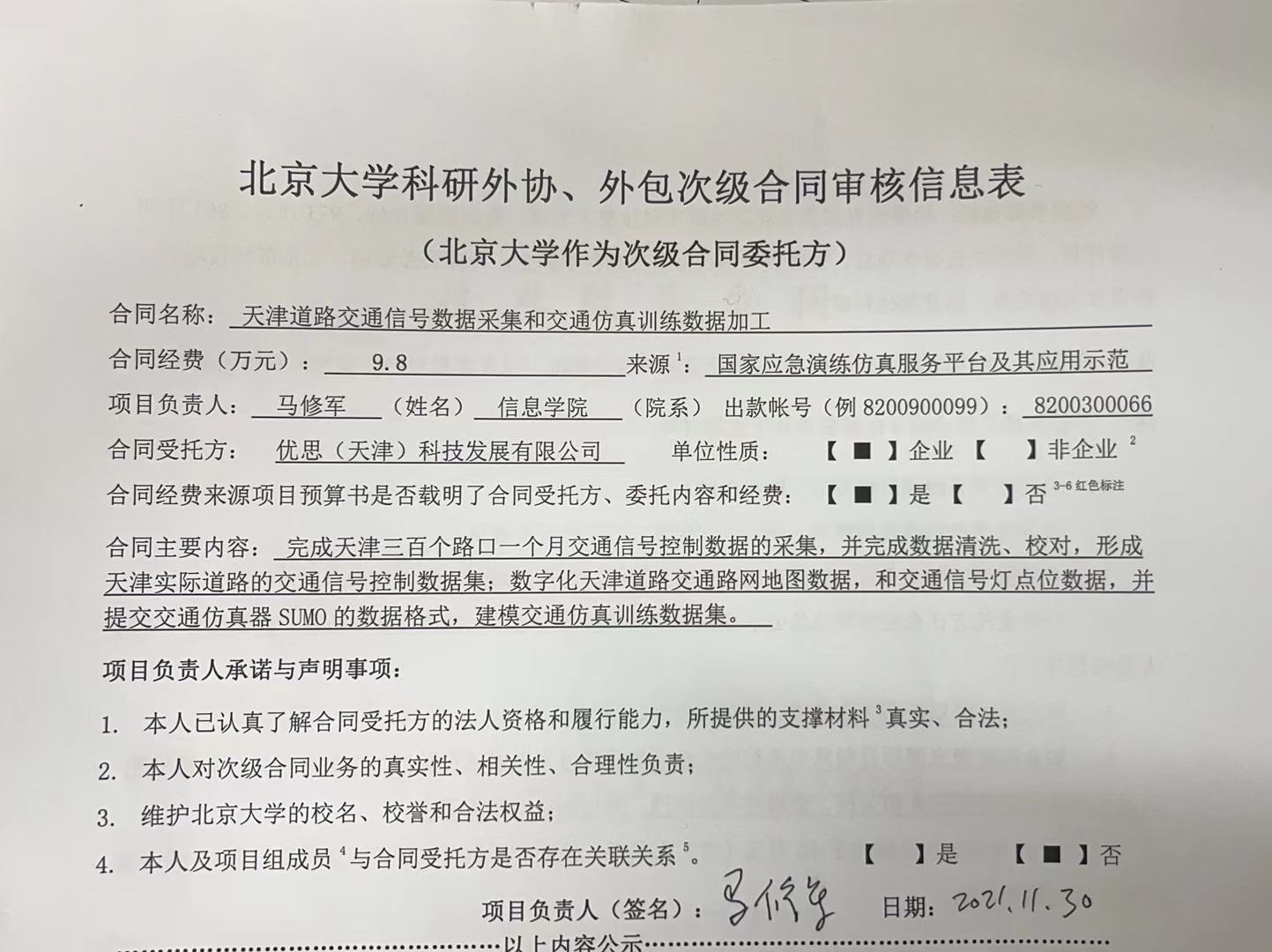 根据《关于北京大学理工科科研次级合同管理的通知》,现将北京大学理工科科研次级合同“天津道路交通信号数据采集和交通仿真训练数据加工”相关内容予以公示。