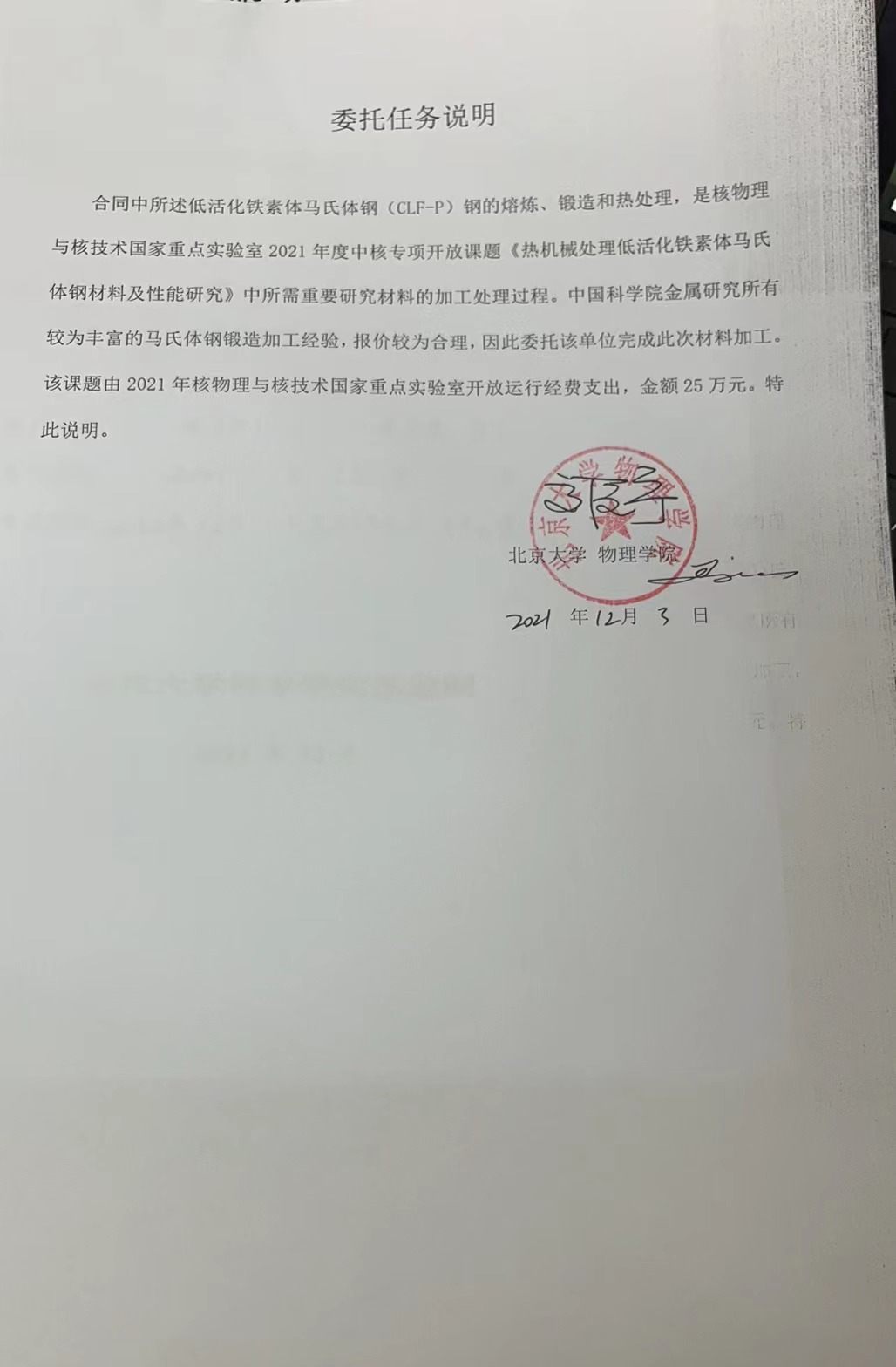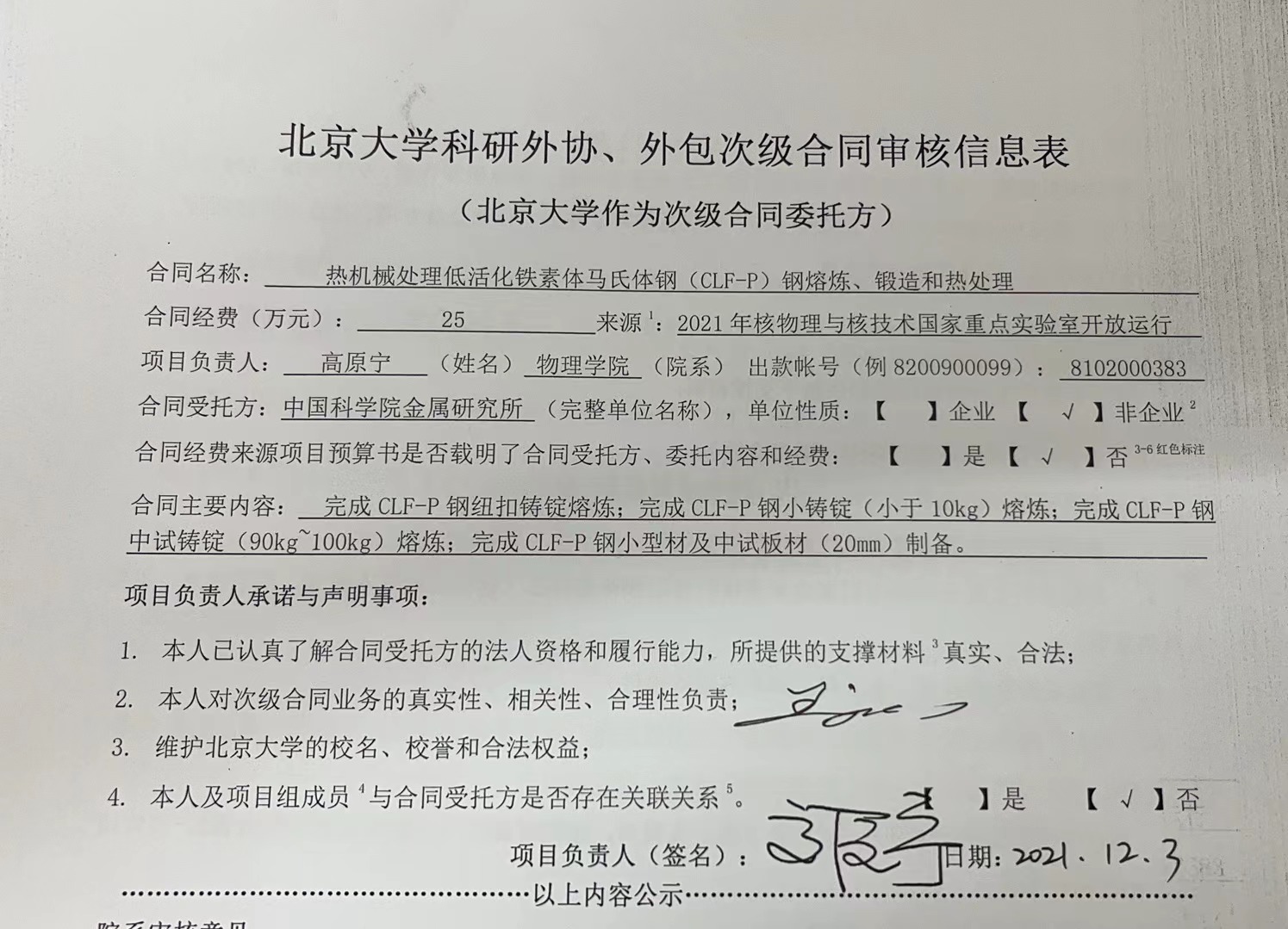 根据《关于北京大学理工科科研次级合同管理的通知》,现将北京大学理工科科研次级合同“热机械处理低活化铁素体马氏体钢(CLF-P)钢熔炼、锻造和热处理”相关内容予以公示。