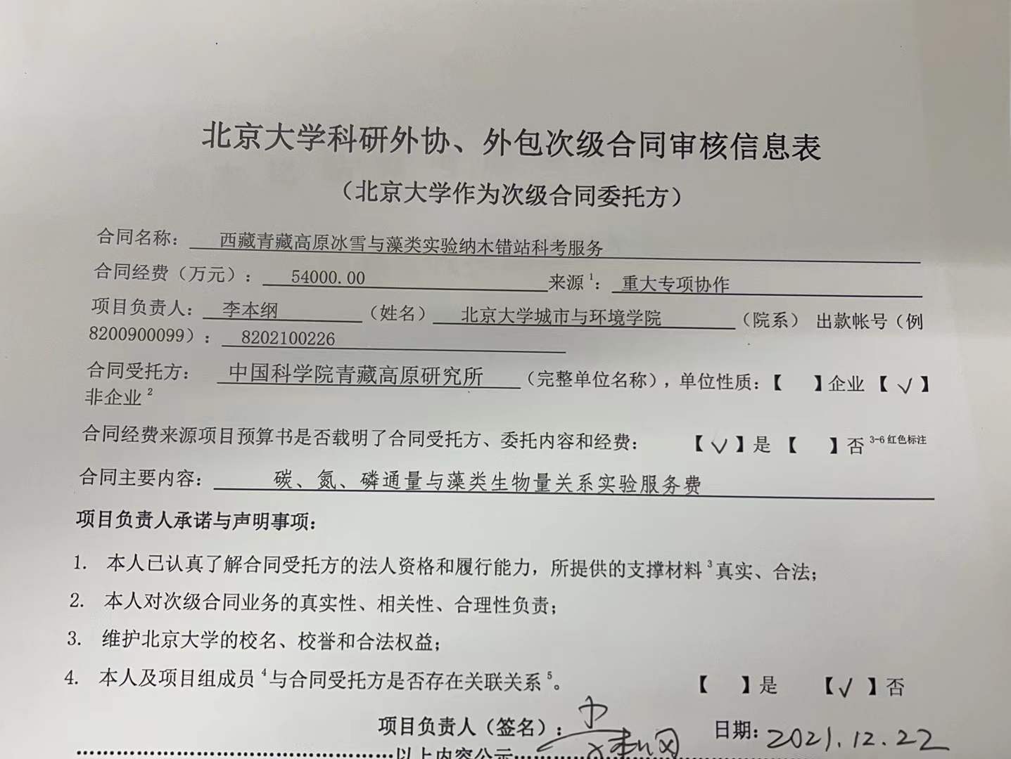 根据《关于北京大学理工科科研次级合同管理的通知》,现将北京大学理工科科研次级合同“西藏青藏高原冰雪与藻类实验纳木错站科考服务”相关内容予以公示。