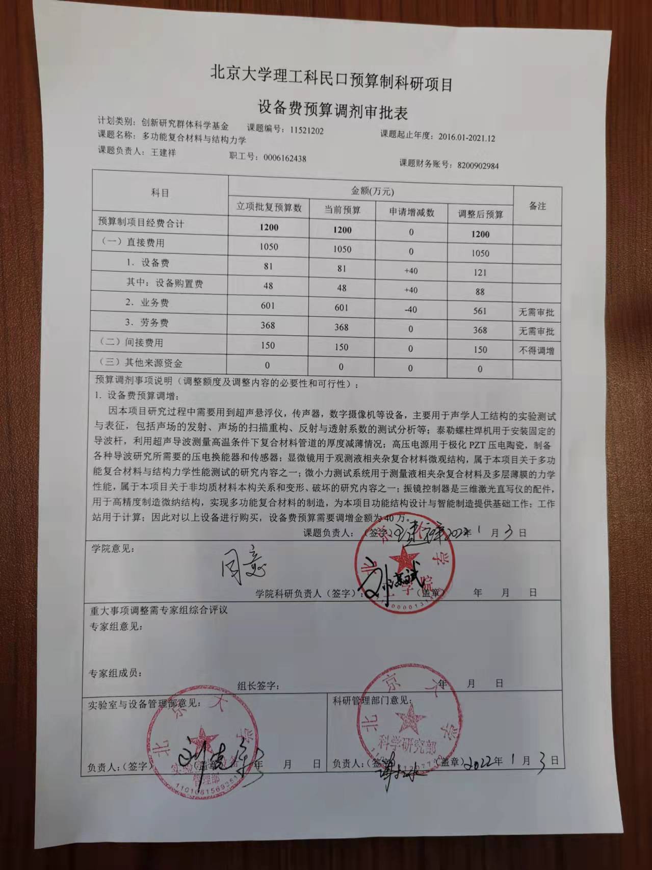 根据《关于实施北京大学理工科民口科研项目预算调剂规定的通知》,现将北京大学理工科民口科研项目“多功能复合材料与结构力学”预算调整申请审批表相关内容予以公示。