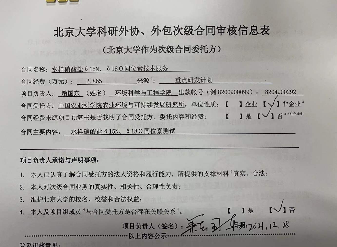 根据《关于北京大学理工科科研次级合同管理的通知》,现将北京大学理工科科研次级合同“水样硝酸盐15N、18O同位素技术服务”相关内容予以公示。