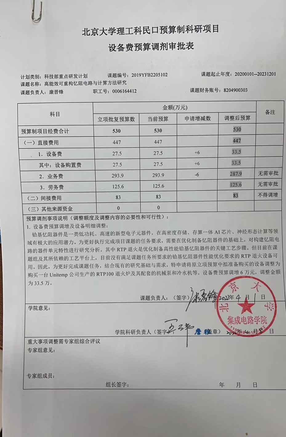 根据《关于实施北京大学理工科民口科研项目预算调剂规定的通知》,现将北京大学理工科民口预算制科研项目“高能效可重构忆阻电路与计算方法研究”设备费预算调剂审批表相关内容予以公示。