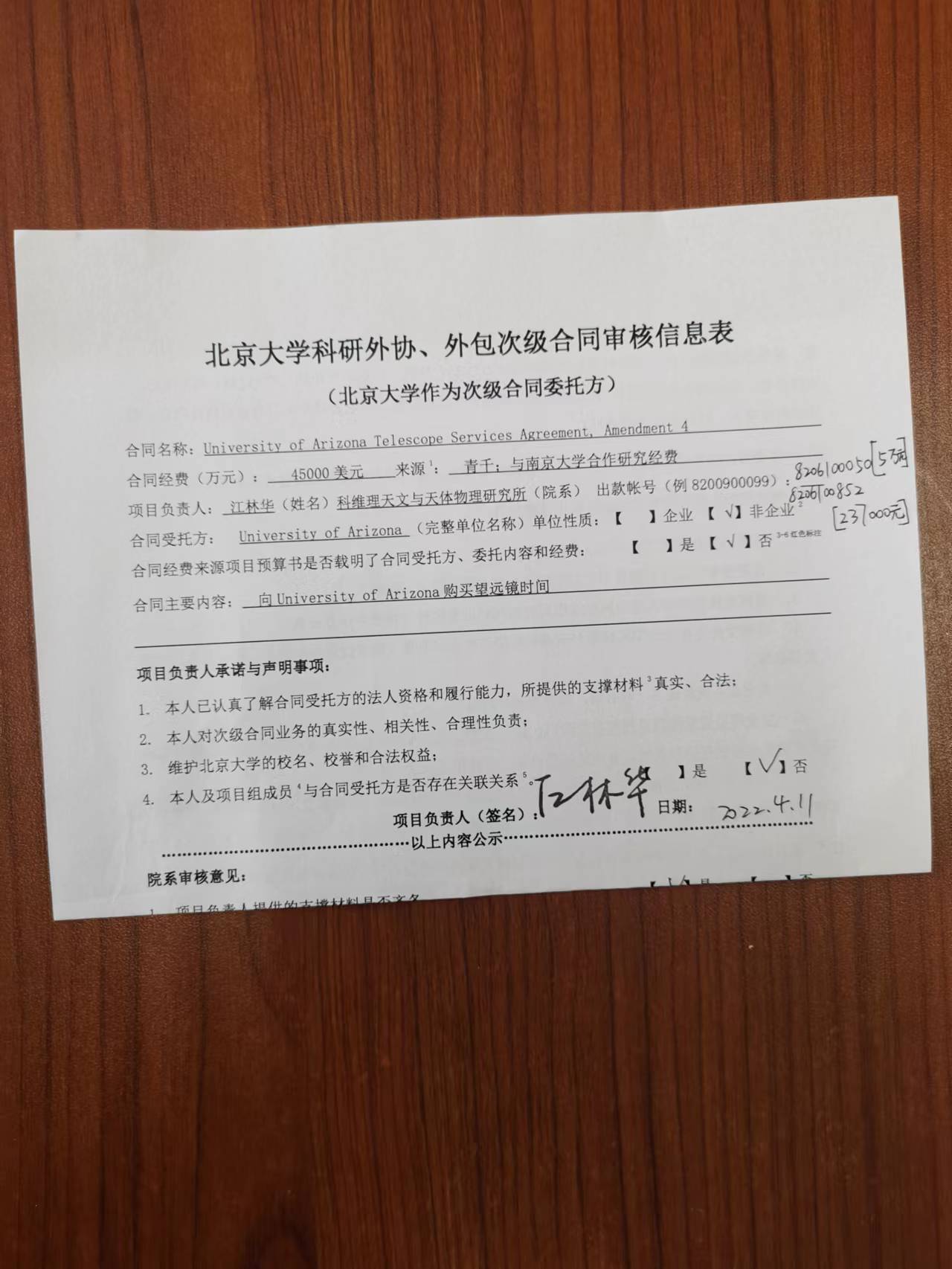 根据《关于北京大学理工科科研次级合同管理的通知》,现将北京大学理工科科研次级合同“University of Arizona Telescope Services Agreement, Amendment 4”相关内容予以公示。