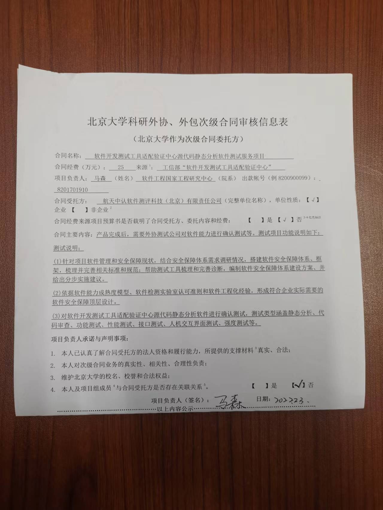 根据《关于北京大学理工科科研次级合同管理的通知》,现将北京大学理工科科研次级合同“软件开发测试工具适配验证中心源代码静态分析软件测试服务项目”相关内容予以公示。