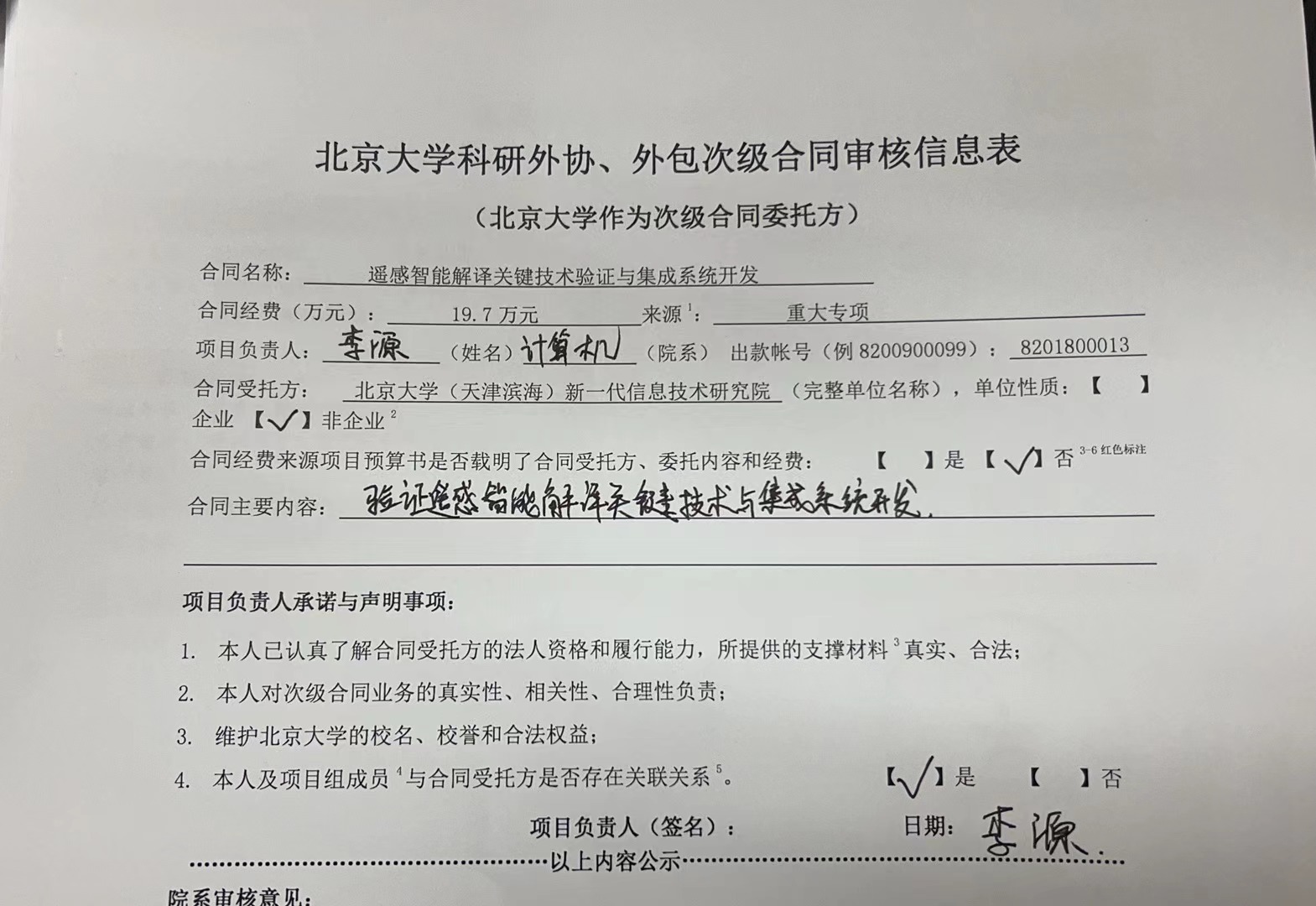 根据《关于北京大学理工科科研次级合同管理的通知》,现将北京大学理工科科研次级合同“遥感智能解译关键技术验证与集成系统开发”相关内容予以公示。