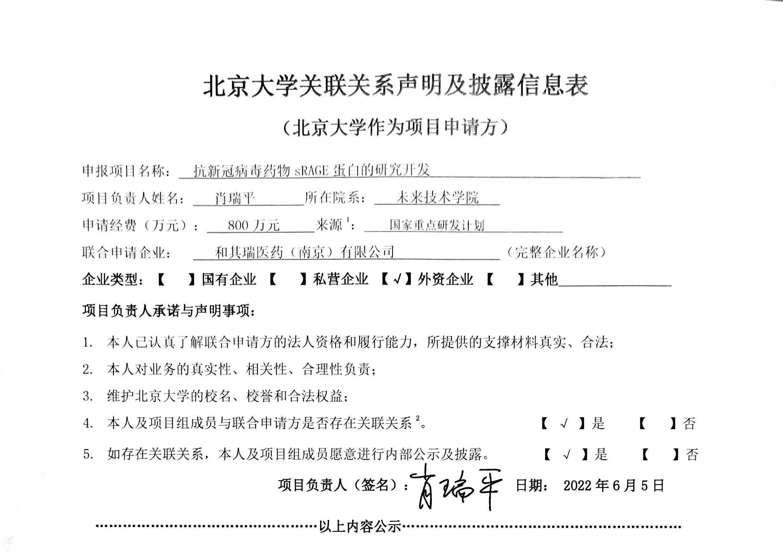根据国家重点研发计划相关管理要求,现将北京大学关联关系声明及披露信息表予以公示。