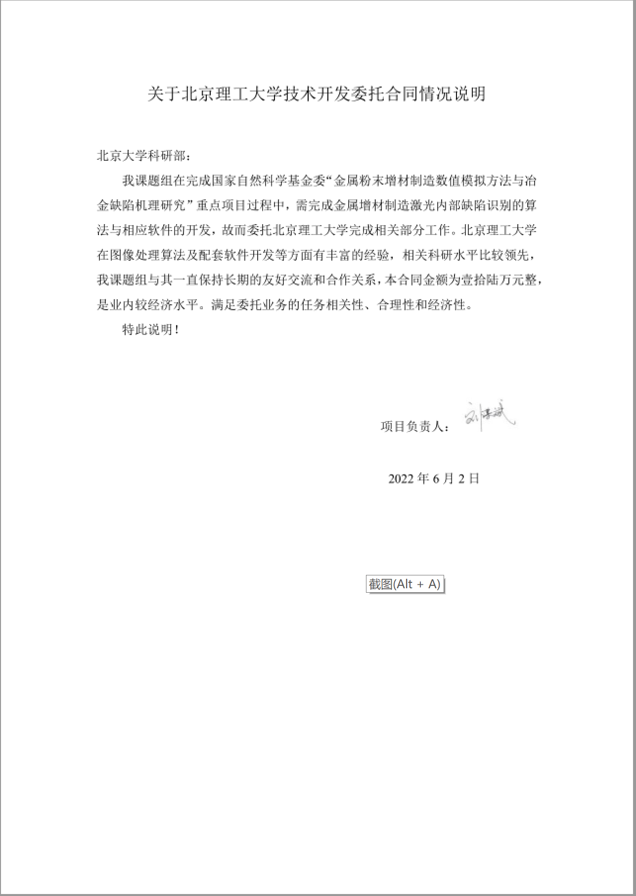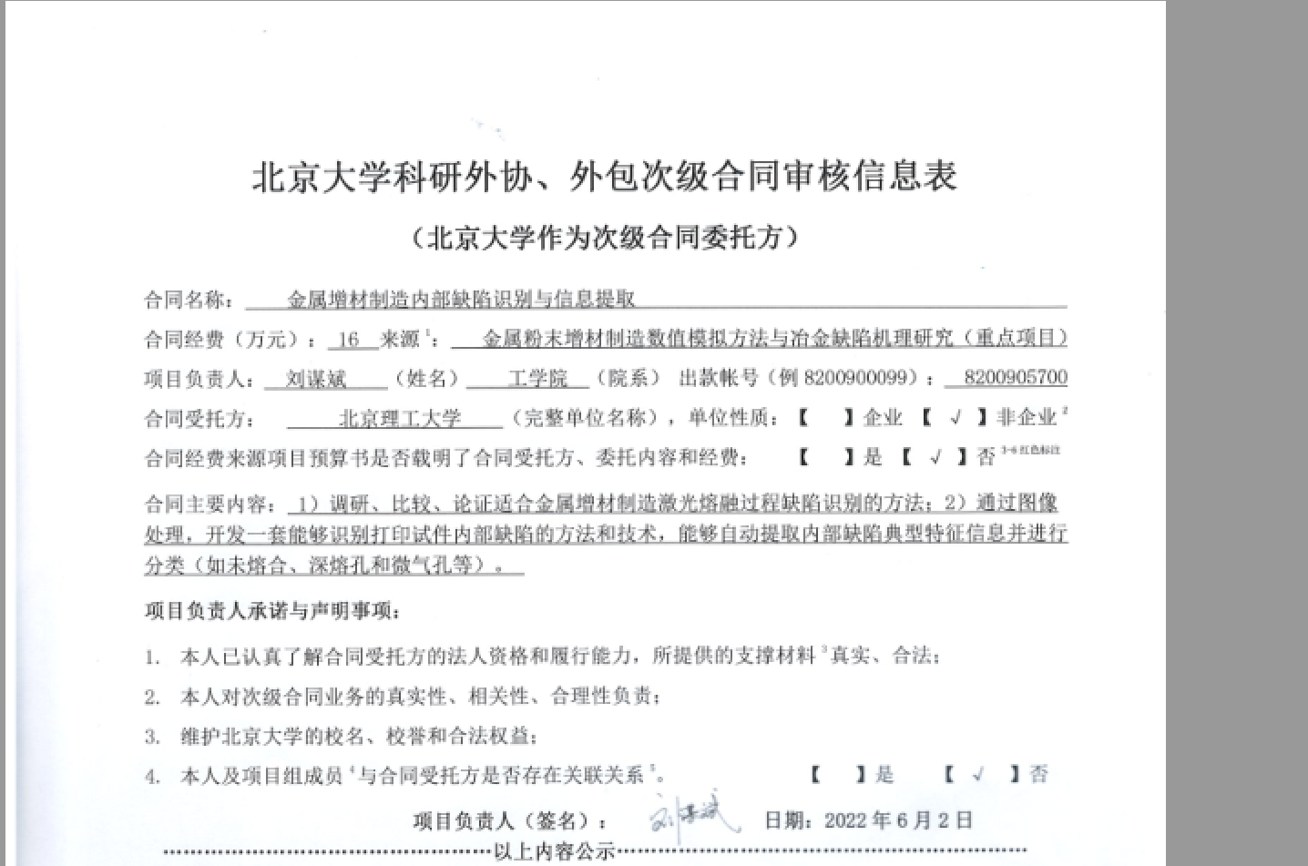 根据《关于北京大学理工科科研次级合同管理的通知》,现将北京大学理工科科研次级合同金属增材制造内部缺陷识别与信息提取”的开发相关内容予以公示。公示时间:2022年06月9日-2021年06月13日(3个工作日)。合同相关纸质材料可经预约后到勺园5乙330办公室进行查阅。