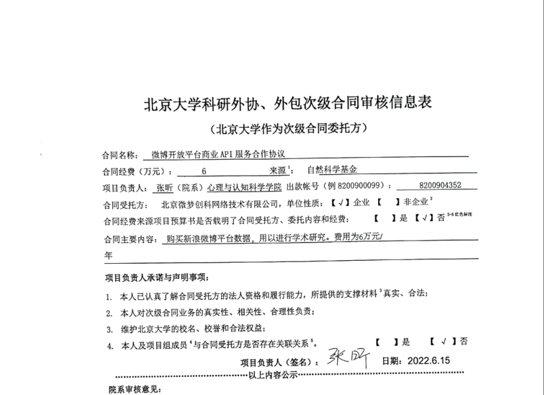 根据《关于北京大学理工科科研次级合同管理的通知》,现将北京大学理工科科研次级合同微博开放平台商业API服务合作协议”的开发相关内容予以公示。公示时间:2022年06月16日-2021年06月20日(3个工作日)。合同相关纸质材料可经预约后到勺园5乙330办公室进行查阅。