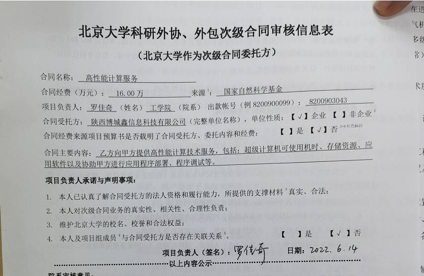 根据《关于北京大学理工科科研次级合同管理的通知》,现将北京大学理工科科研次级合同高性能计算服务”的开发相关内容予以公示。公示时间:2022年06月20日-2021年06月22日(3个工作日)。合同相关纸质材料可经预约后到勺园5乙330办公室进行查阅。