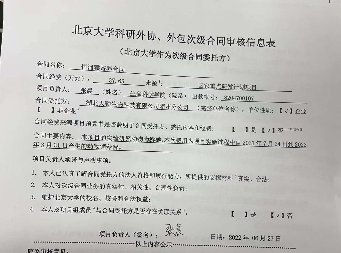 根据《关于北京大学理工科科研次级合同管理的通知》,现将北京大学理工科科研次级合同“恒河猴寄养合同”相关内容予以公示。