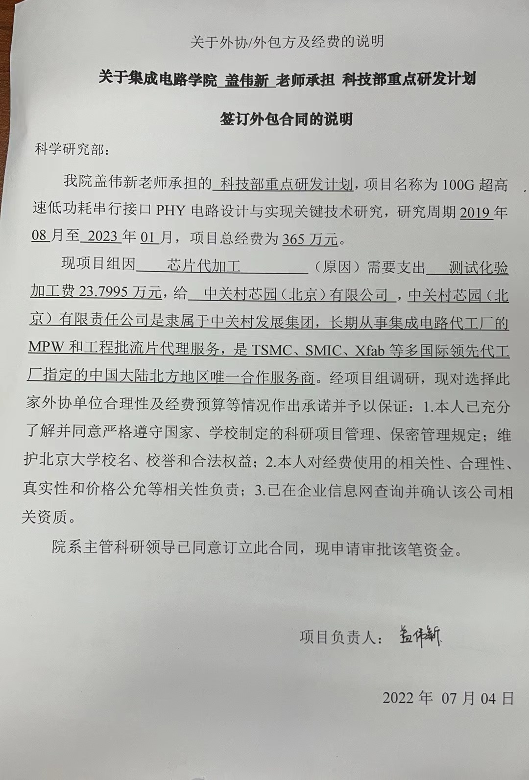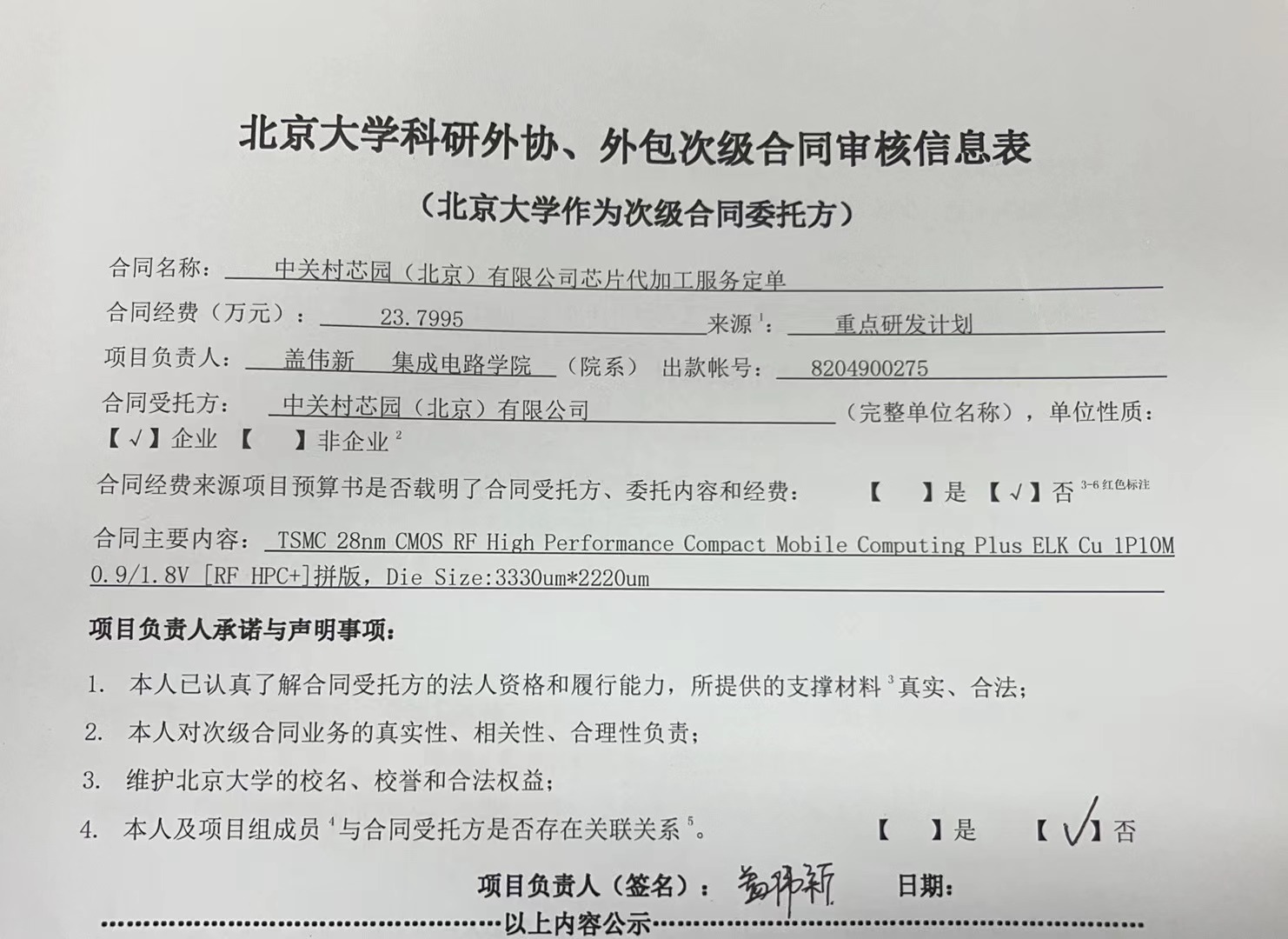 根据《关于北京大学理工科科研次级合同管理的通知》,现将北京大学理工科科研次级合同“中关村芯园(北京)有限公司芯片代加工服务定单”相关内容予以公示。