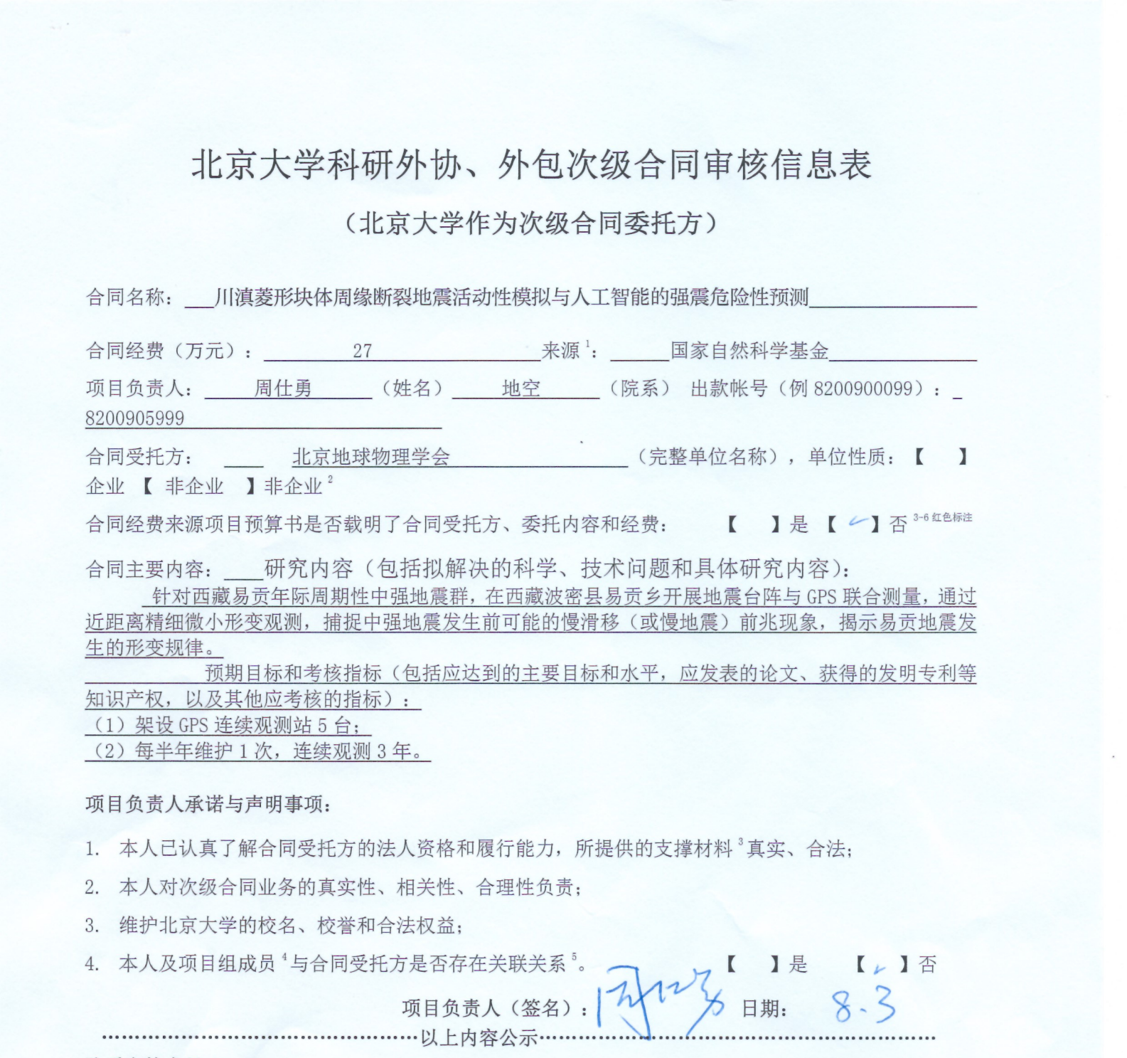 根据《关于北京大学理工科科研次级合同管理的通知》,现将北京大学理工科科研次级合同川滇菱形块体周缘地震活动性模拟与人工智能的强震危害性预测”的开发相关内容予以公示。公示时间:2022年08月07日-2022年08月10日(3个工作日)。合同相关纸质材料可经预约后到勺园5乙330办公室进行查阅。