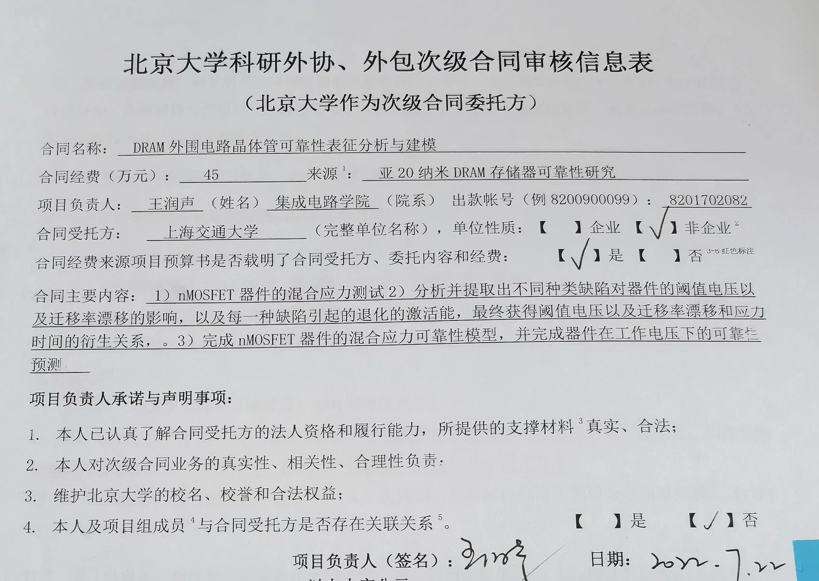 根据《关于北京大学理工科科研次级合同管理的通知》,现将北京大学理工科科研次级合同DRAM外围电路晶体管可靠性表征分析与建模”的开发相关内容予以公示。公示时间:2022年08月15日-2022年08月17日(3个工作日)。合同相关纸质材料可经预约后到勺园5乙330办公室进行查阅。