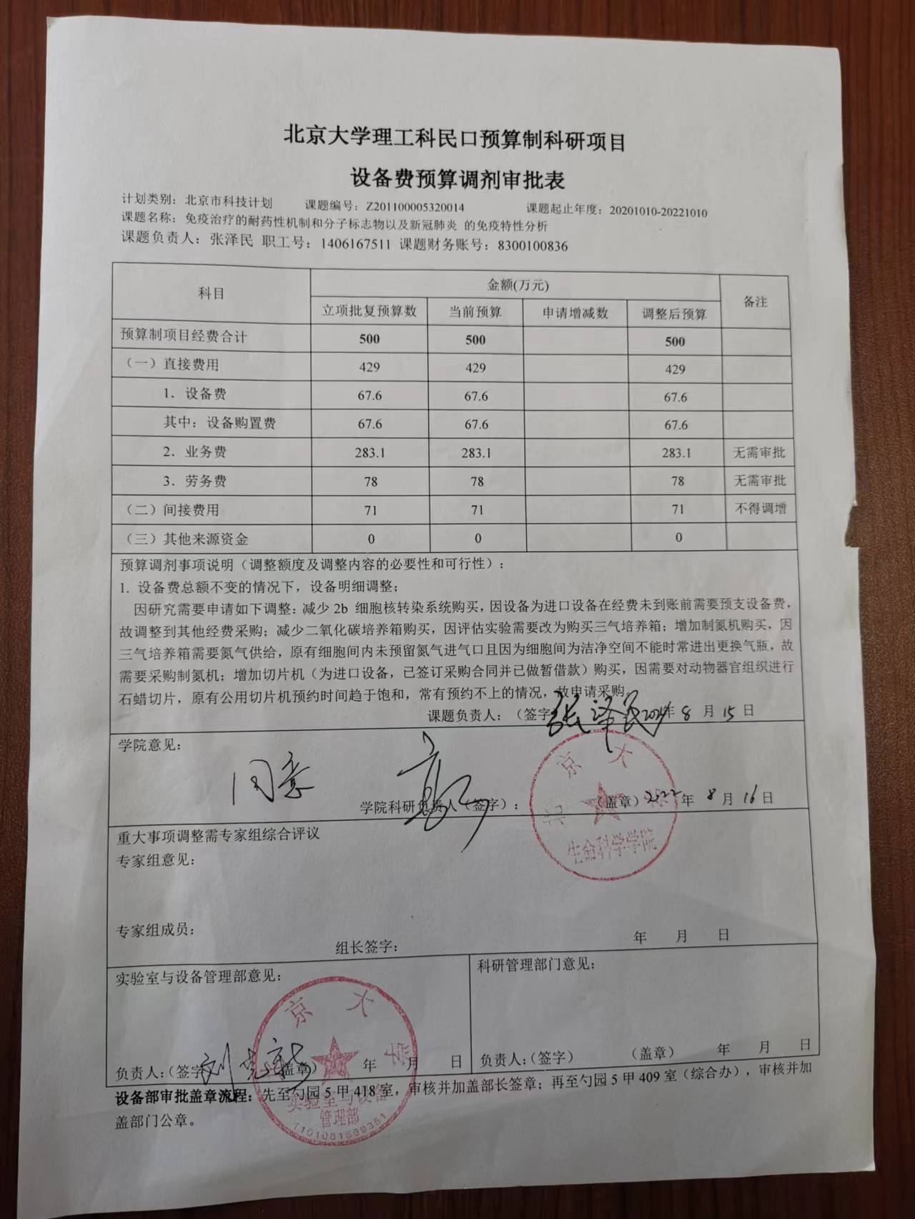 根据《关于实施北京大学理工科民口科研项目预算调剂规定的通知》,现将北京大学理工科民口预算制科研项目“免疫治疗的耐药性机制和分子标志物以及新冠肺炎的免疫特性分析”设备费预算调剂审批表相关内容予以公示。