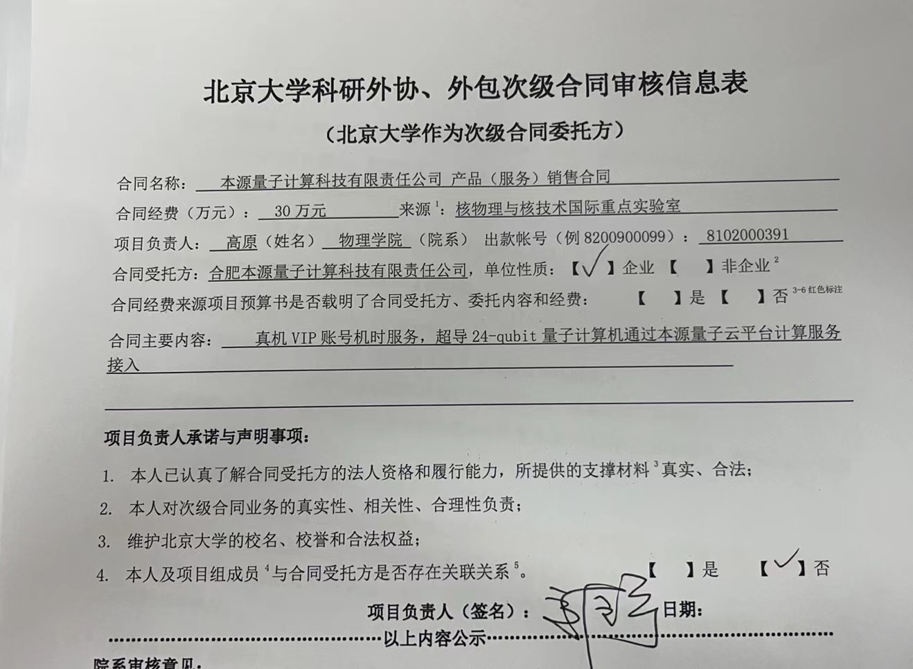 根据《关于北京大学理工科科研次级合同管理的通知》,现将北京大学理工科科研次级合同“木源量子计算科技有限责任公司产品(服务)销售合同”相关内容予以公示。