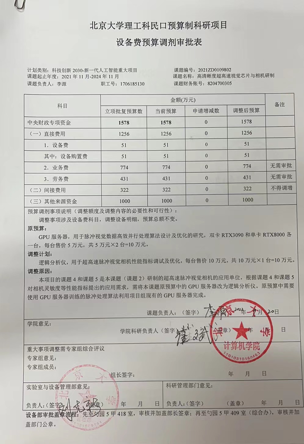 根据《关于实施北京大学理工科民口科研项目预算调剂规定的通知》,现将北京大学理工科民口预算制科研项目“高清晰度超高速视觉芯片与相机研制”设备费预算调剂审批表相关内容予以公示。