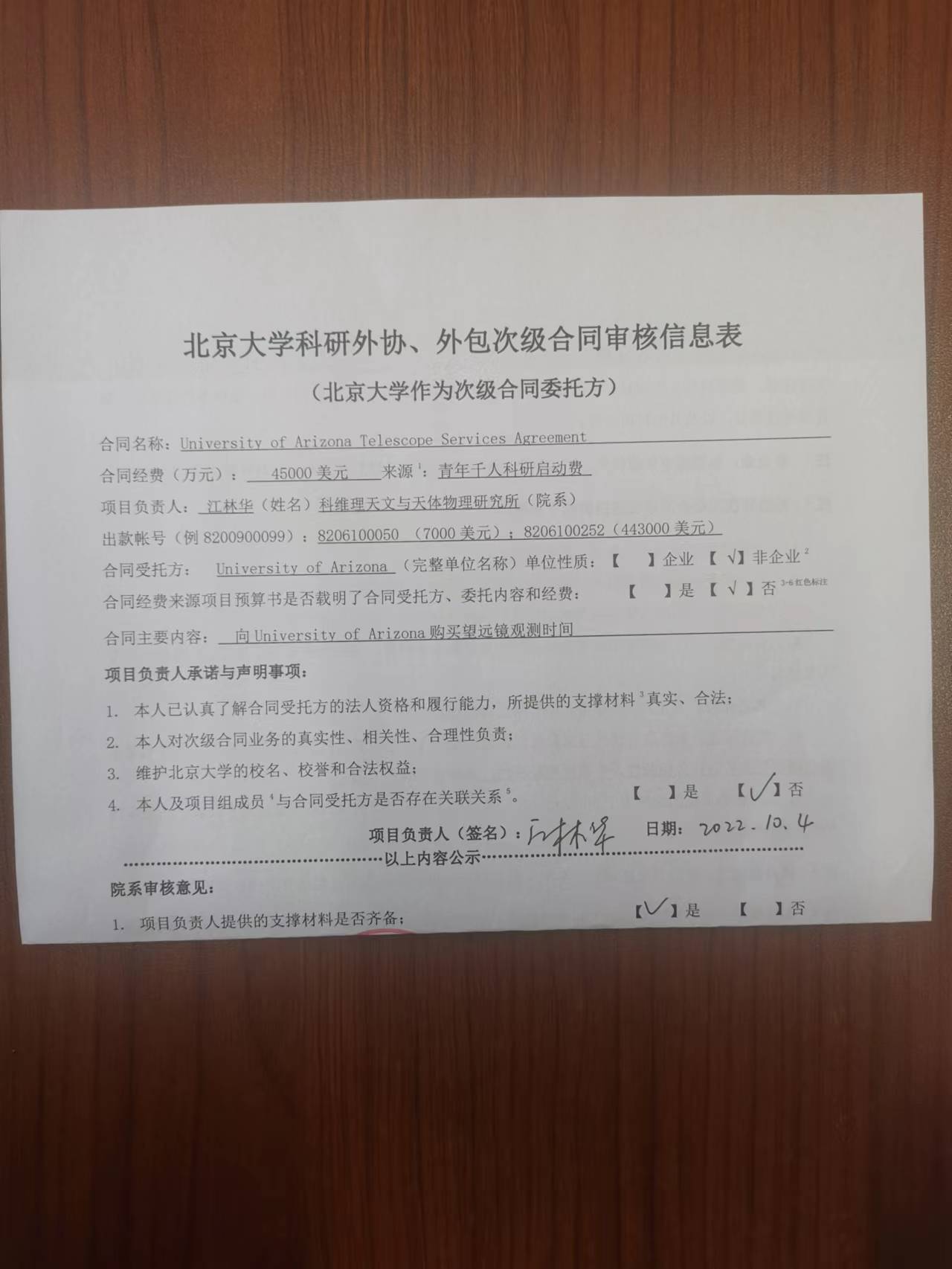 根据《关于北京大学理工科科研次级合同管理的通知》,现将北京大学理工科科研次级合同“University of Arizona Telescope Services Agreement”相关内容予以公示。