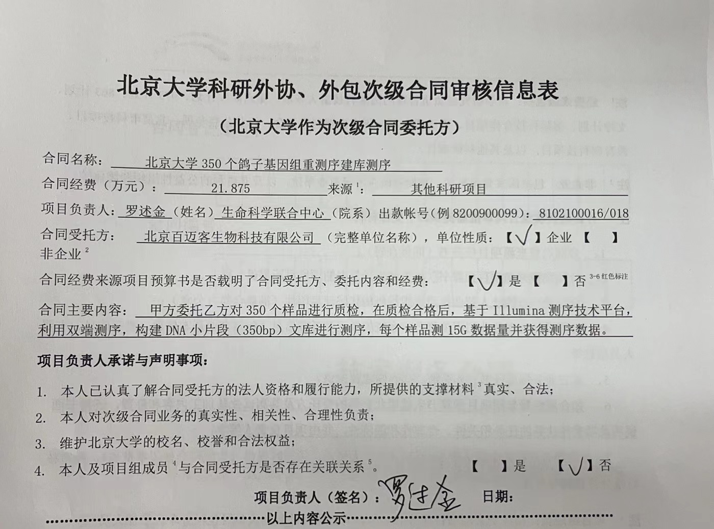根据《关于北京大学理工科科研次级合同管理的通知》,现将北京大学理工科科研次级合同“北京大学350个鸽子基因组重测序建库测序”相关内容予以公示。