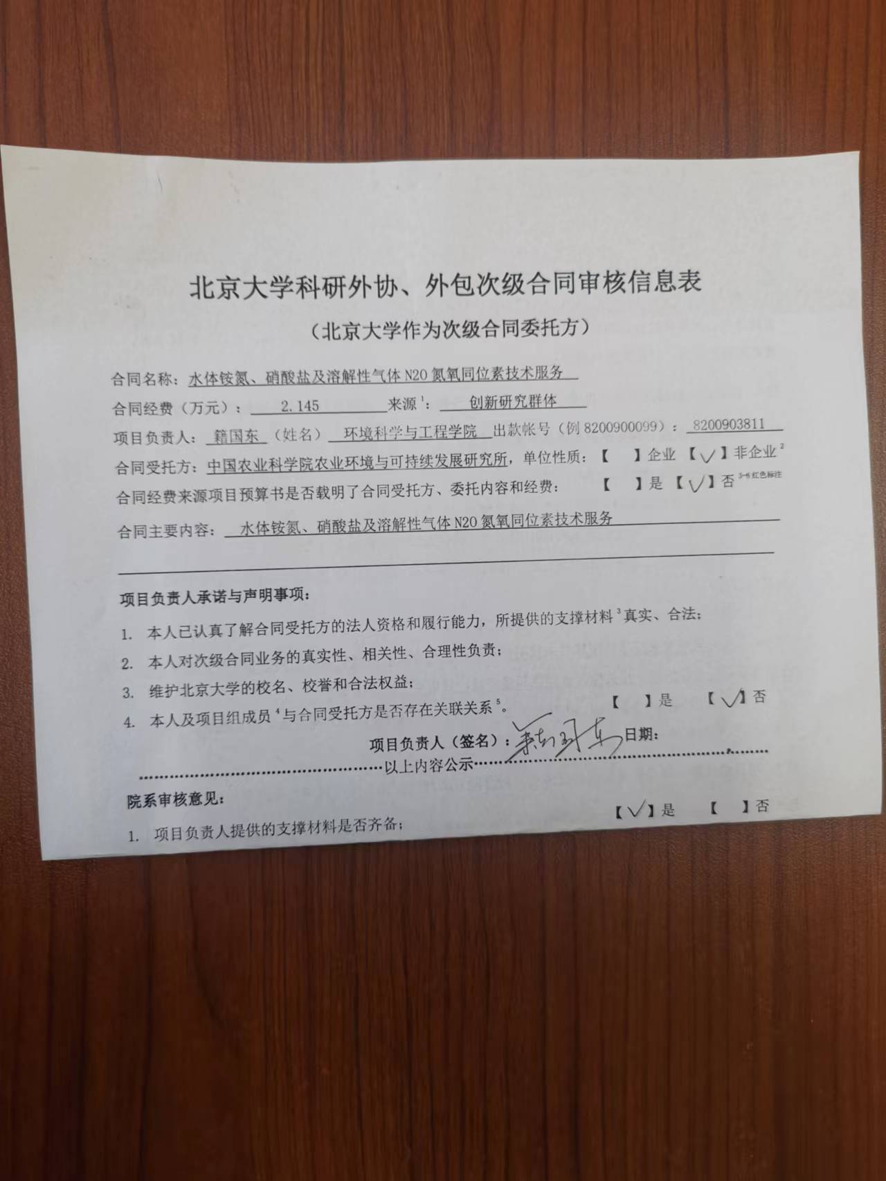 根据《关于北京大学理工科科研次级合同管理的通知》,现将北京大学理工科科研次级合同“水体氨氮、硝酸盐及溶解性气体N20氮氧同位素技术服务”相关内容予以公示。