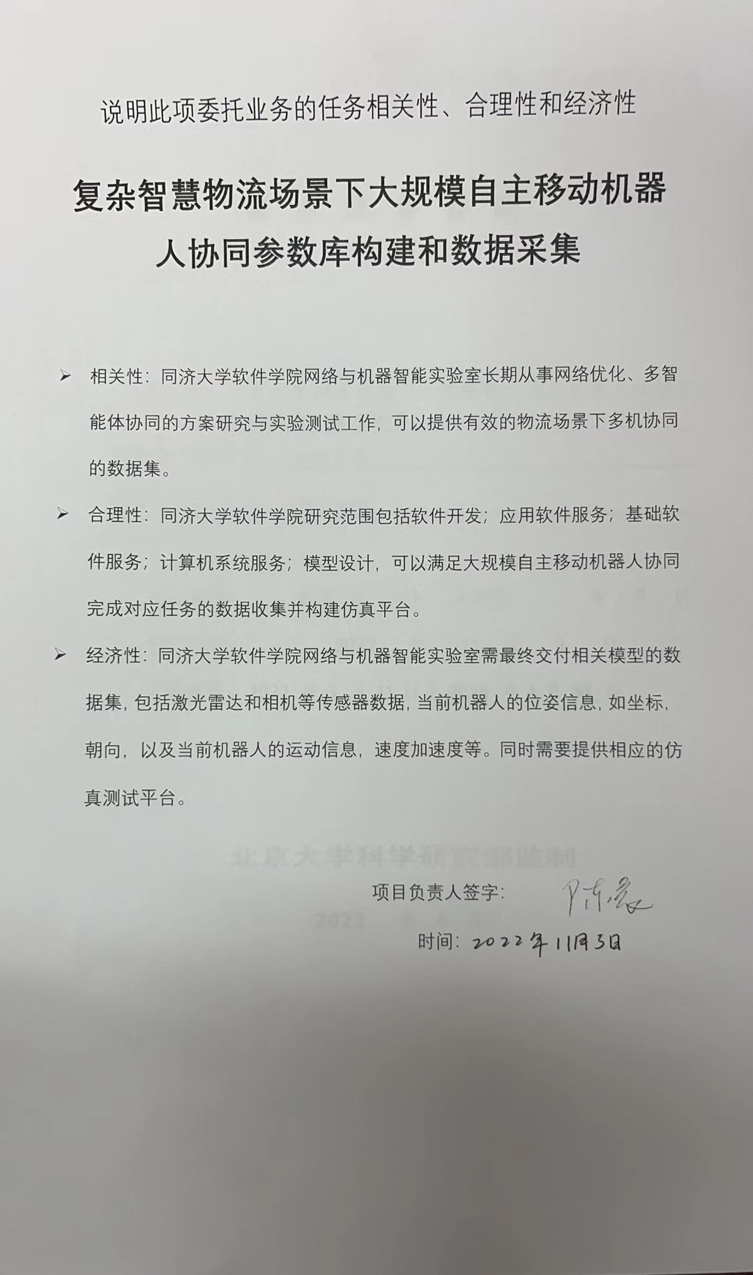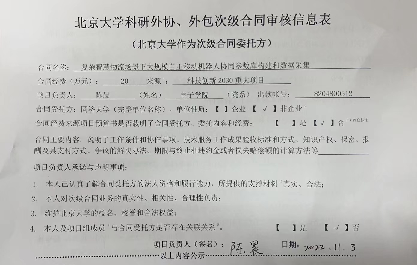 根据《关于北京大学理工科科研次级合同管理的通知》,现将北京大学理工科科研次级合同“复杂智慧物流场景下大规模自主移动机器人协同参数库构建和数据采集”相关内容予以公示。