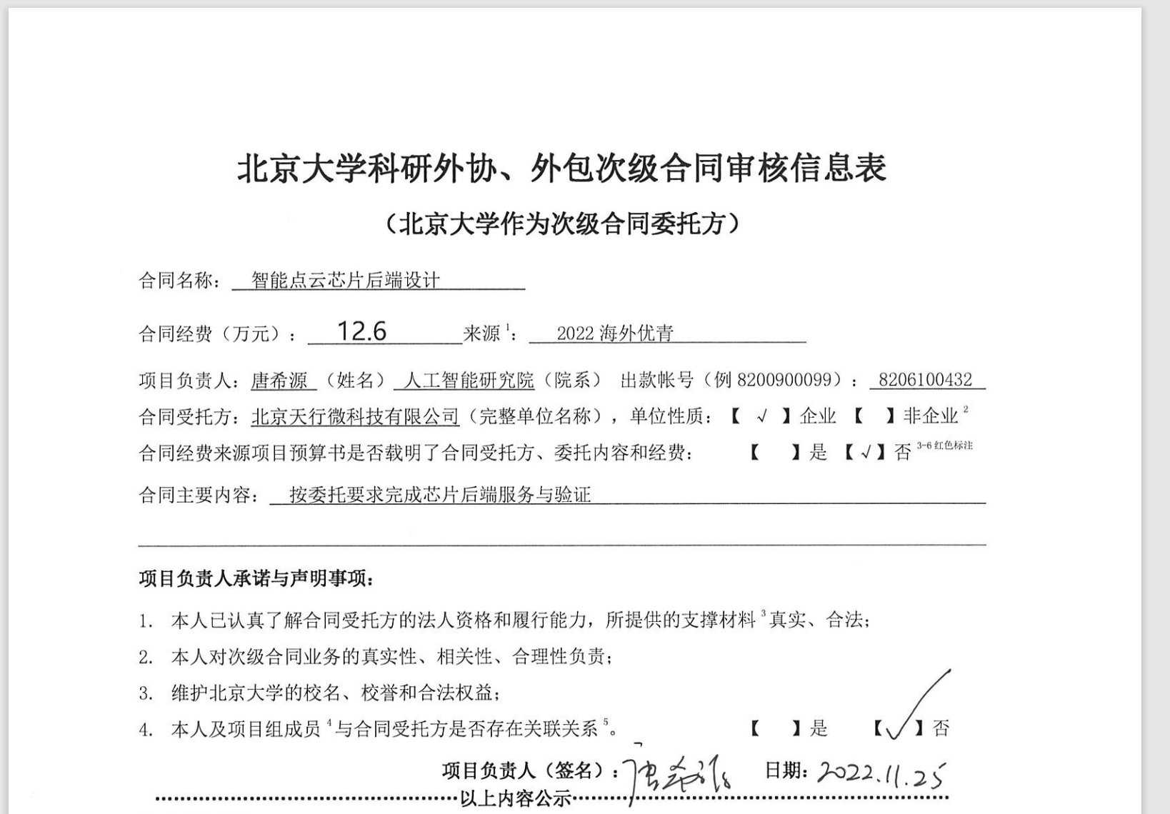 根据《关于北京大学理工科科研次级合同管理的通知》,现将北京大学理工科科研次级合同智能点云芯片后端设计”的相关内容予以公示。公示时间:2022年11月229日-2022年12月1日(3个工作日)。合同相关纸质材料可经预约后到勺园5乙330办公室进行查阅。