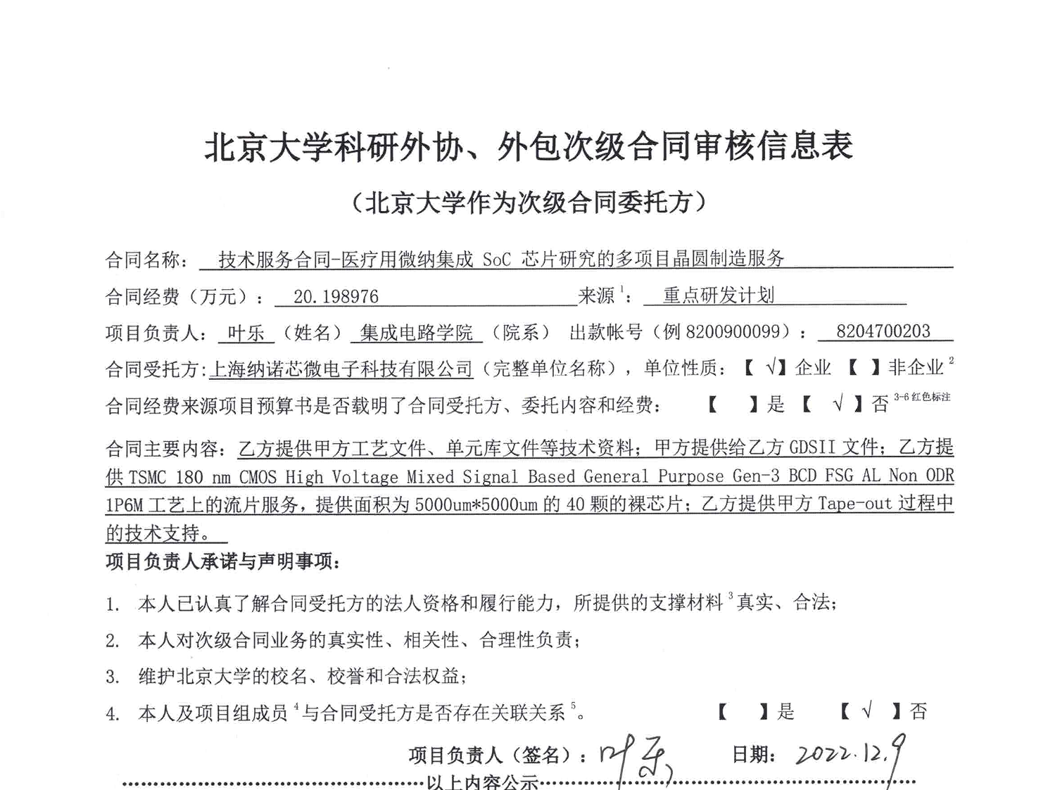 根据《关于北京大学理工科科研次级合同管理的通知》,现将北京大学理工科科研次级合同“技术服务合同-医疗用微纳集成SoC芯片研究的多项目晶圆制造服务”相关内容予以公示。