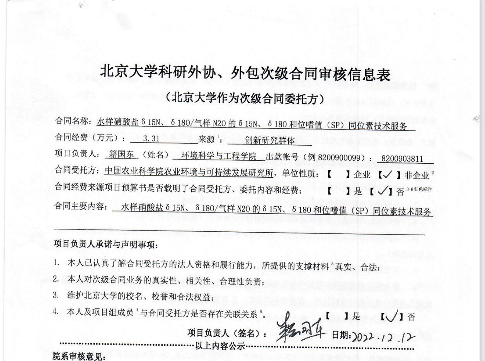 根据《关于北京大学理工科科研次级合同管理的通知》,现将北京大学理工科科研次级合同“水样硝酸盐 和位嗜值(SP)同位素合同”的相关内容予以公示。公示时间:2022年12月13日-2022年12月15日(3个工作日)。合同相关纸质材料可经预约后到勺园5乙330办公室进行查阅。