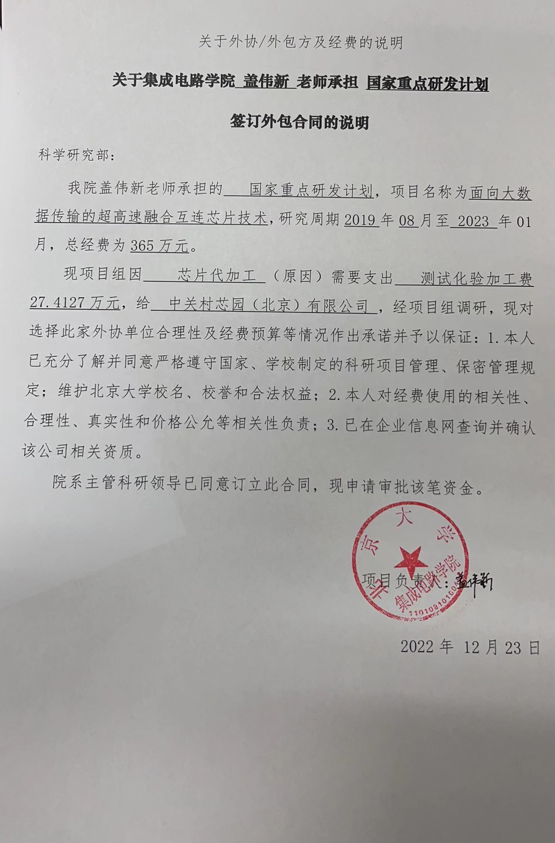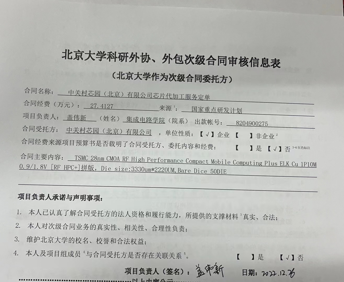 根据《关于北京大学理工科科研次级合同管理的通知》,现将北京大学理工科科研次级合同“中关村芯园(北京)有限公司芯片代加工服务定单”相关内容予以公示。