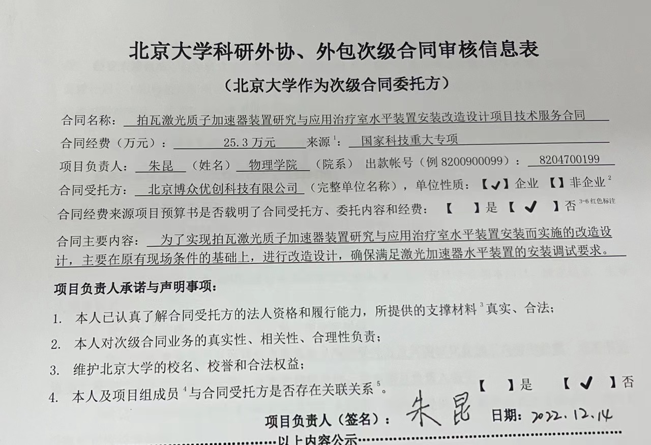 根据《关于北京大学理工科科研次级合同管理的通知》,现将北京大学理工科科研次级合同“拍瓦激光质子加速器装置研究与应用治疗室水平装置安装改造设计项目技术服务合同”相关内容予以公示。