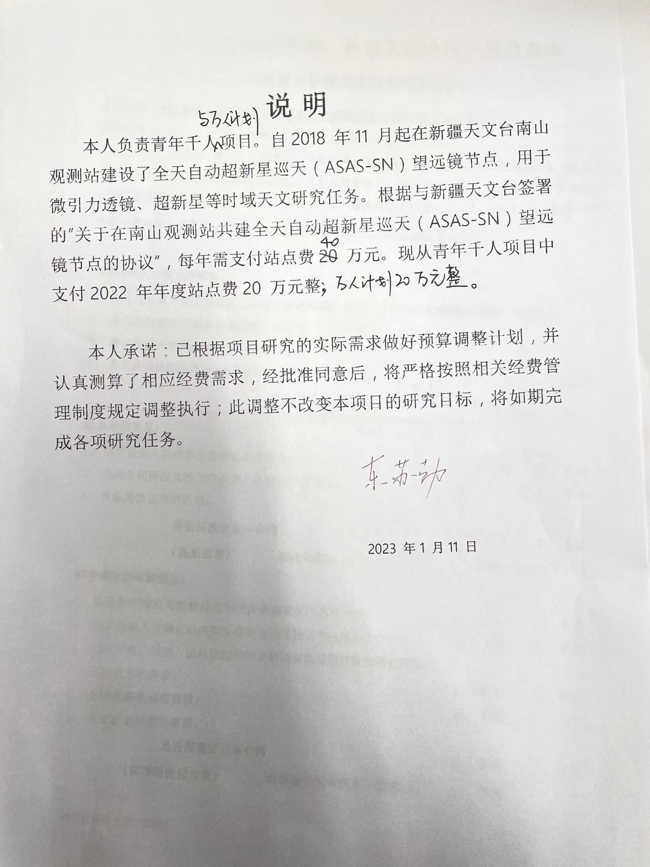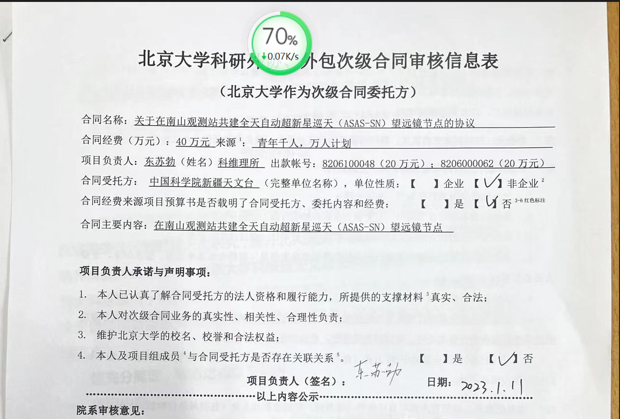 根据《关于北京大学理工科科研次级合同管理的通知》,现将北京大学理工科科研次级合同“关于在南山观察站共建全天自动超新星巡天望远镜节点的协议”的相关内容予以公示。公示时间:2023年01月11日-2023年01月13日(3个工作日)。合同相关纸质材料可经预约后到勺园5乙330办公室进行查阅。