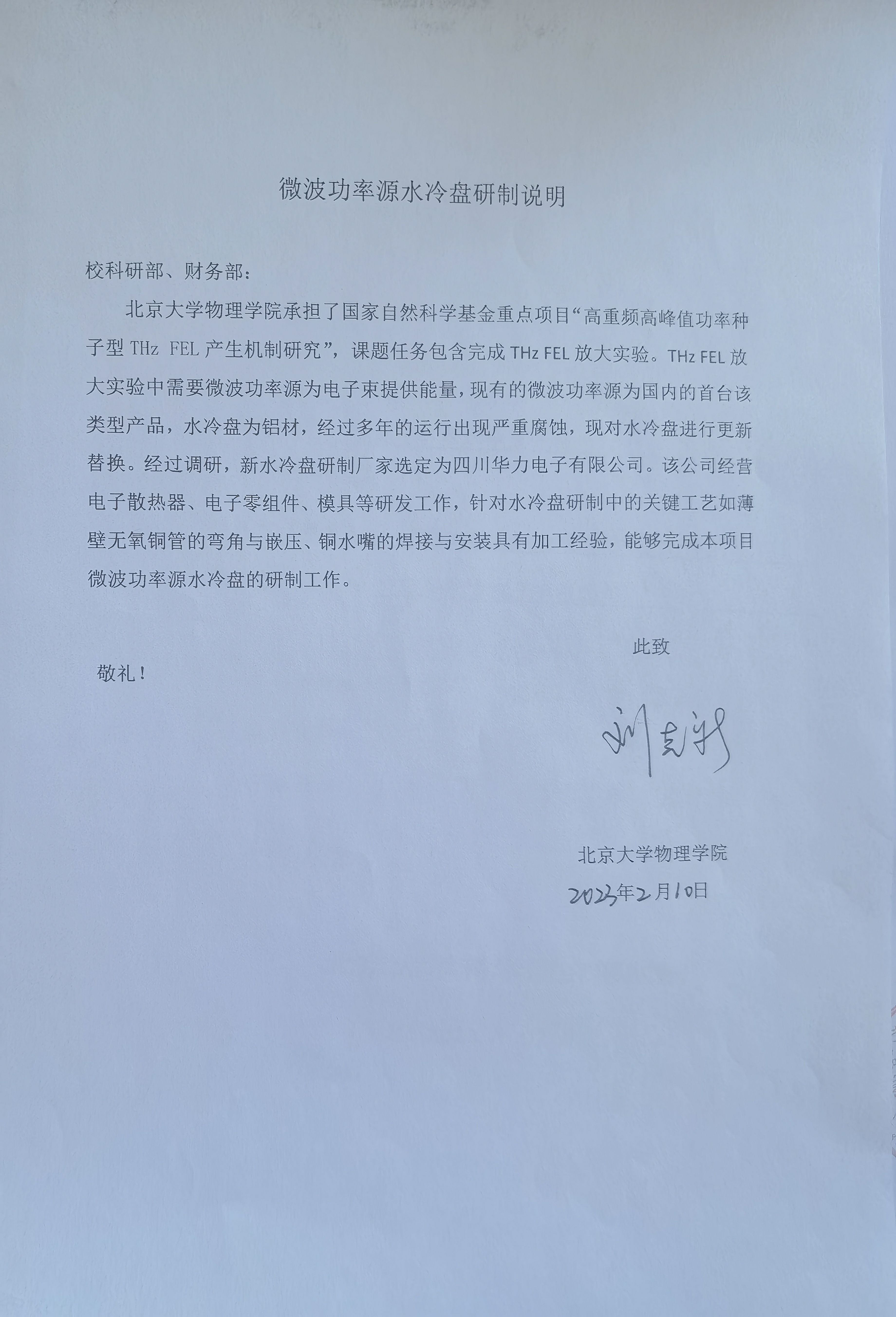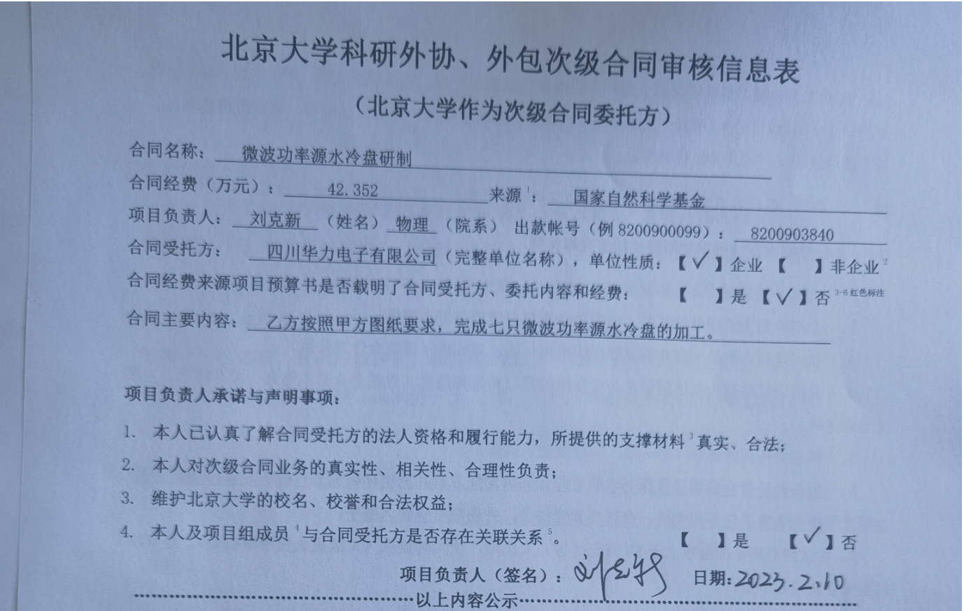 根据《关于北京大学理工科科研次级合同管理的通知》,现将北京大学理工科科研次级合同“微波功率源水冷盘研制”的相关内容予以公示。公示时间:2023年02月13日-2023年02月15日(3个工作日)。合同相关纸质材料可经预约后到勺园5乙330办公室进行查阅。