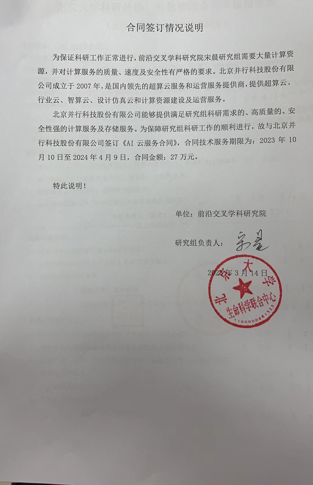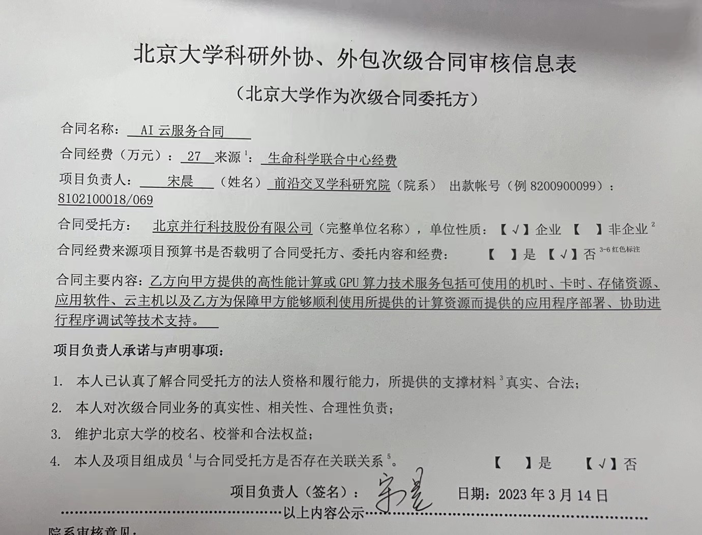 北京大学理工科科研次级合同“AI云服务合同”公示
